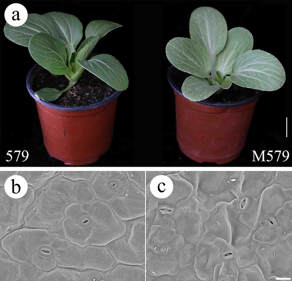 Morphological characterization of wild-type '579' and mutant M579. (a) '579' with green leaves and M579 with gray leaves. Bar = 2 cm. (b, c) Scanning electron microscopy observations of '579' and M579. Bar = 200 μm.
