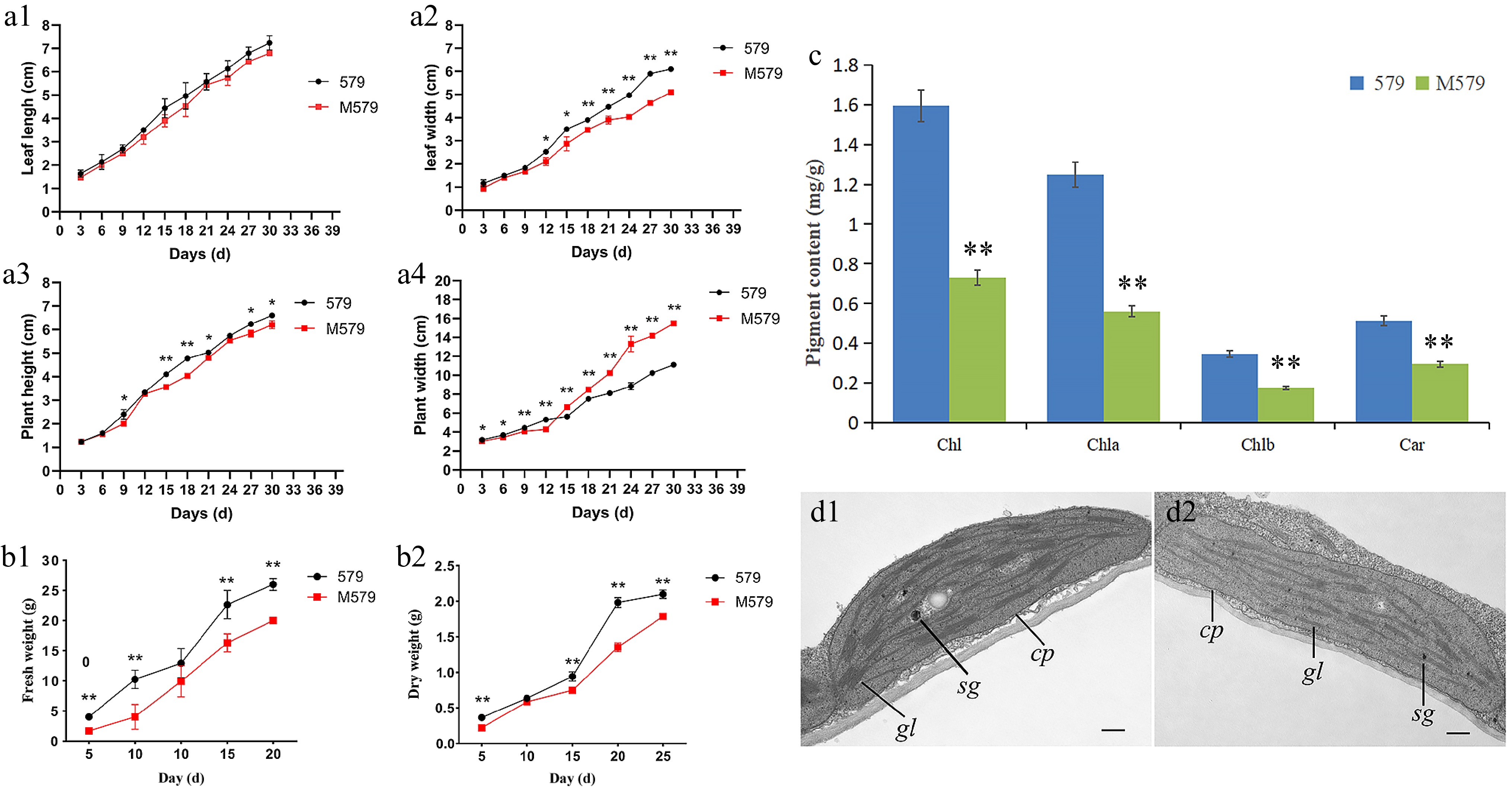 Agronomic trait analysis of '579' and M579. (a) Growth potential curves of '579' and M579: (a1) leaf length, (a2) leaf width, (a3) plant height, and (a4) plant width. (b1) Fresh weight of '579' and M579. (b2) Dry weight of '579' and M579. (c) Photosynthetic pigment content of '579' and M579. (d) Transmission electron microscopy (TEM) analysis of chloroplasts in (d1) '579', and (d2) M579.