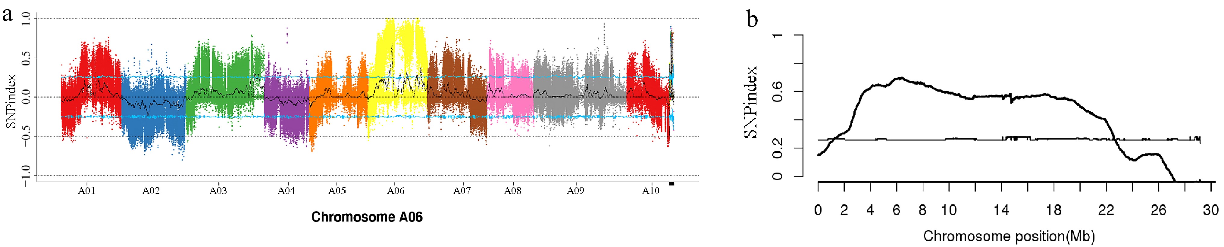 Single nucleotide polymorphism (SNP) index mapping chart. (a) SNP index distribution on the chromosomes of pakchoi. (b) The candidate gene for the gray leaf trait was mapped to chromosome A06.