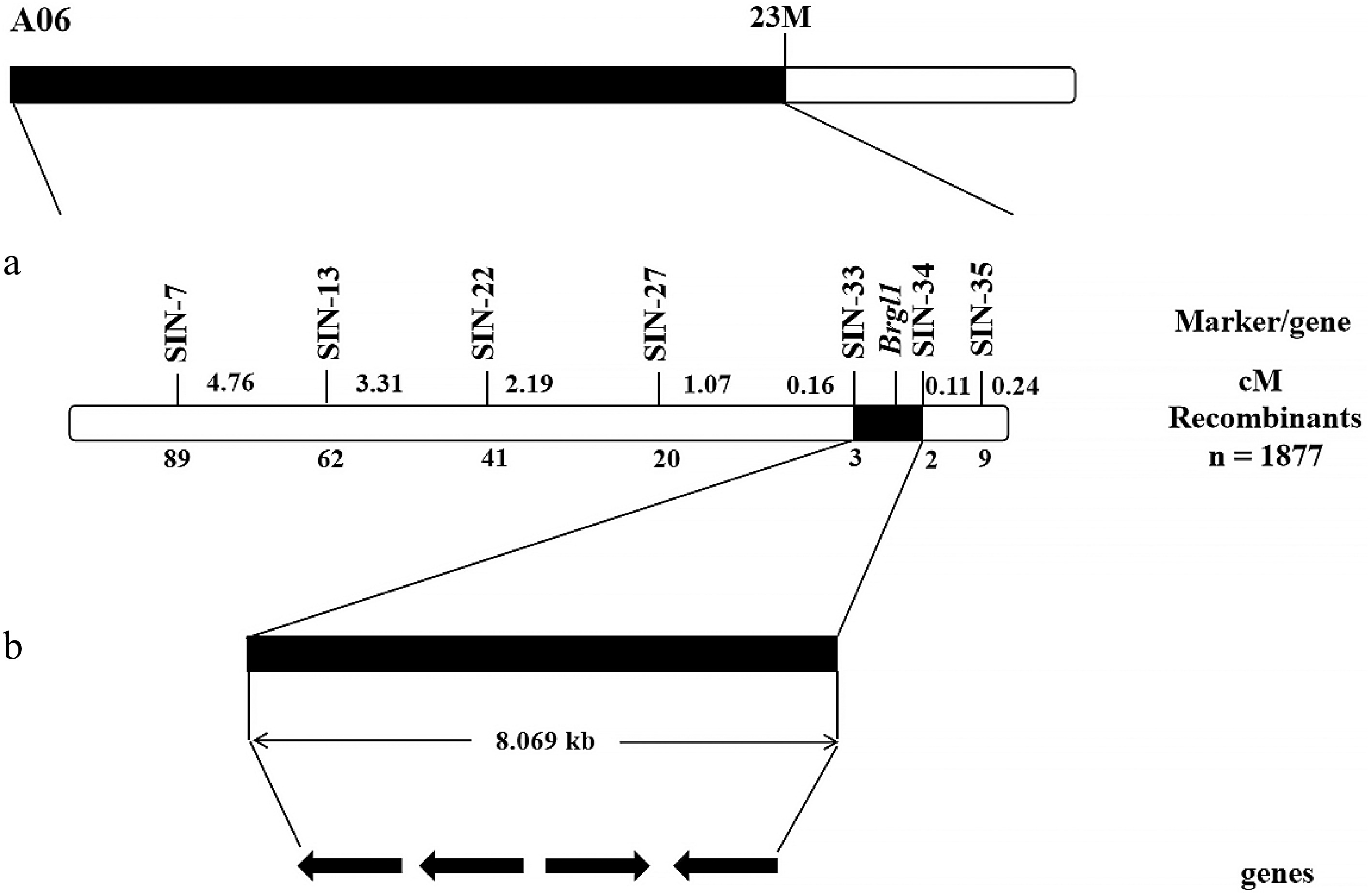 The genetic and physical maps of Brgl1. (a) Brgl1 was mapped between the molecular markers SIN-33 and SIN-34. (b) The 8.069 kb region between SIN-33 and SIN-34 containing four genes.