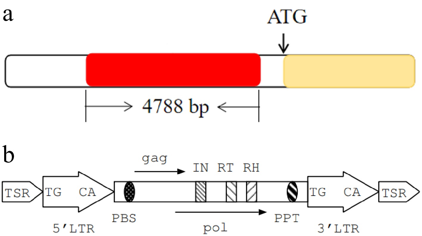 Gene structural features. (a) Structural features of the Brgl1 gene and the insertion fragment. The yellow box represents the Brgl1 gene, the red box represents the insertion fragment. (b) Structural features of transposon TNT 1-94.