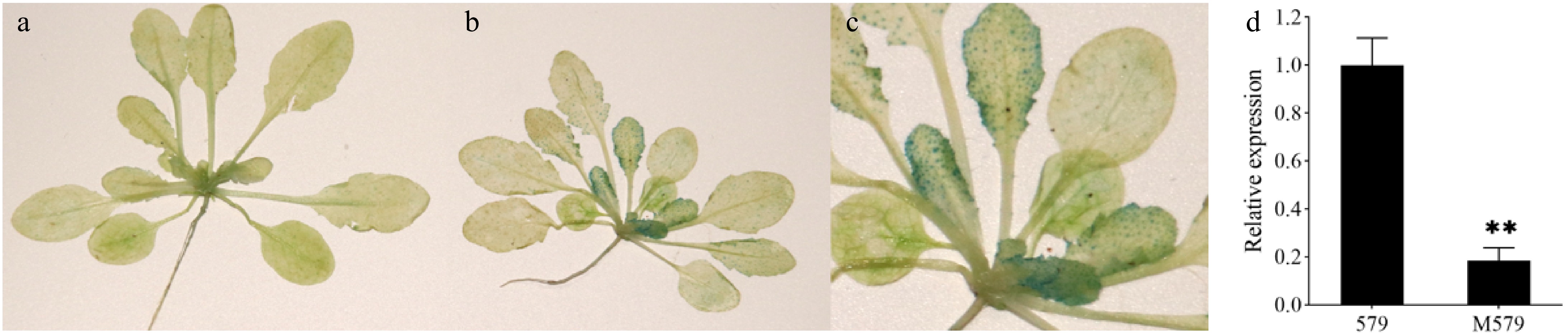 Expression patterns of the Brgl1 gene. (a) GUS staining of the control in Arabidopsis. (b) GUS-stained positive plants in Arabidopsis. (c) Close-up of GUS-stained positive plants in Arabidopsis. (d) qRT-PCR analysis of Brgl1 in the leaves of '579' and M579.