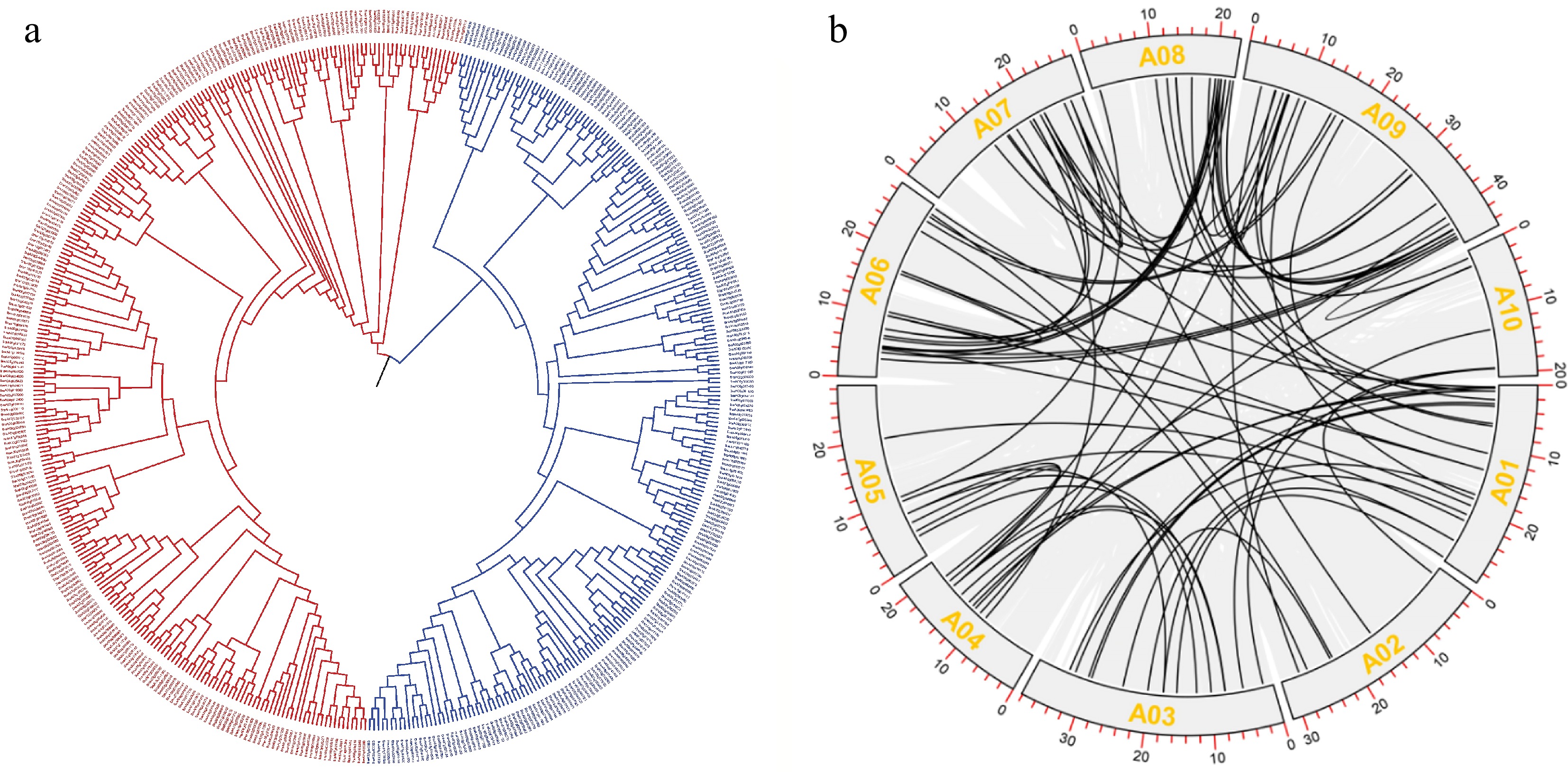 Evolutionary analysis of PPR proteins. (a) Phylogenetic tree of PPR proteins. (b) Co-linearity analysis of PPR proteins.