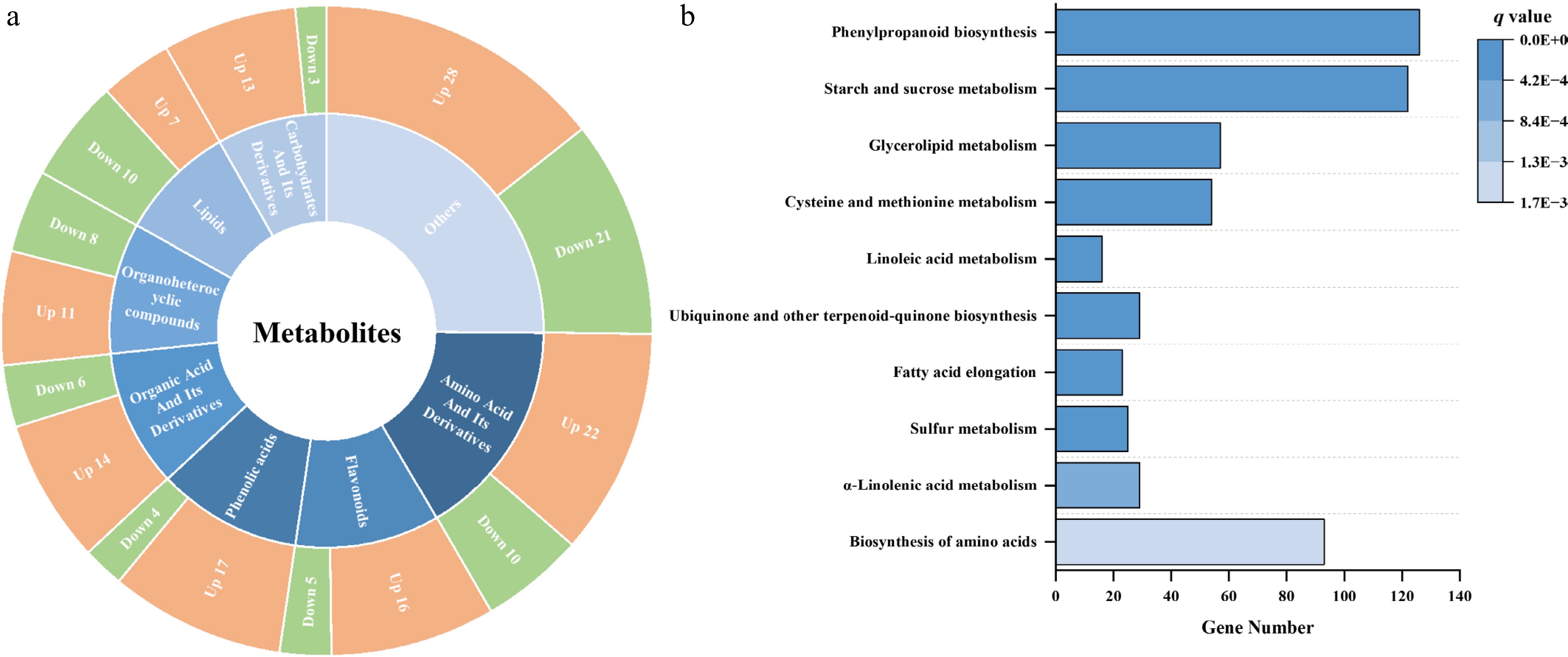 Overview of differentially accumulated metabolites (DAMs) and gene enrichment between the control and GABA-treated samples after 4 days of storage. (a) Pie chart summarizing the classification and number of upregulated and downregulated DAMs between control and GABA-treated baby mustard. (b) KEGG enrichment analysis of differentially expressed genes (DEGs) identified between the control and GABA treatment groups after 4 days.