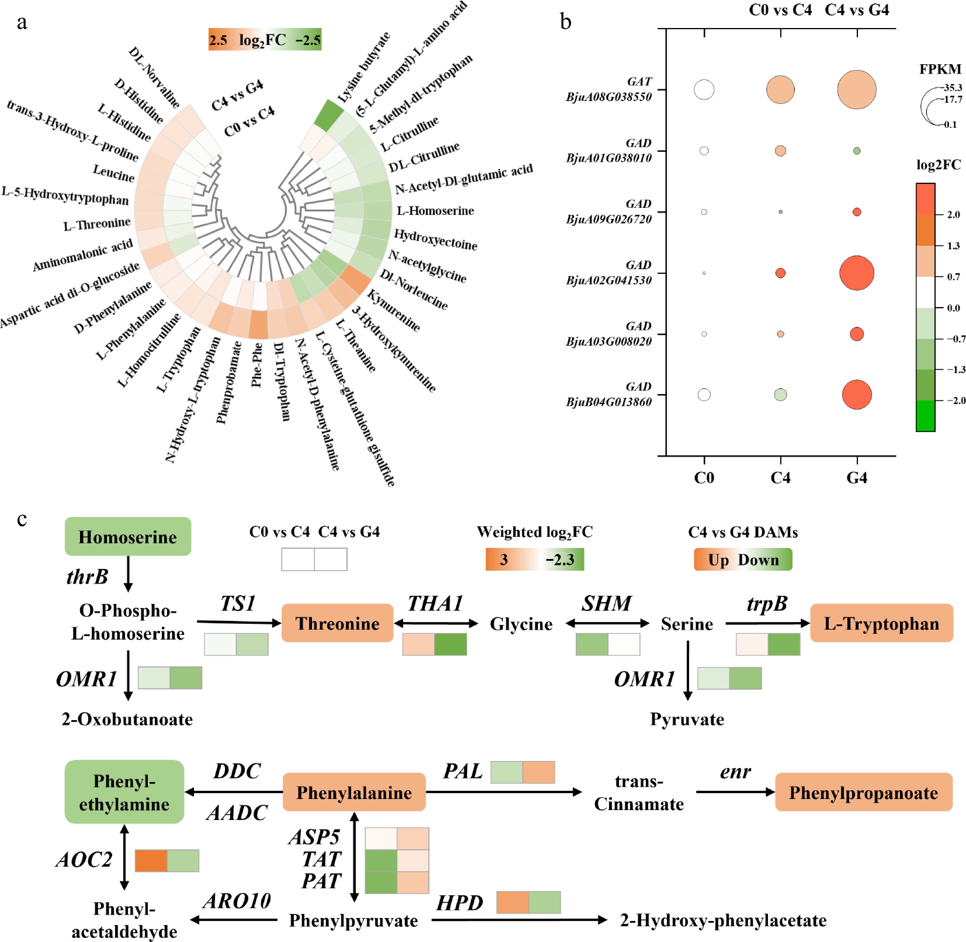 Weighted log2FC analysis of amino acid-related genes further revealed divergent transcriptional responses (Fig. 3c). Genes involved in phenylalanine metabolism, including phenylalanine ammonia-lyase (PAL, 1.7) and bifunctional aspartate/prephenate aminotransferase (PAT, 1.3), were upregulated. Aspartate aminotransferase 5 (ASP5, 1.0) and tyrosine aminotransferase (TAT, 0.5) also showed positive responses. In contrast, genes associated with threonine biosynthesis and degradation, such as threonine aldolase (THA, –2.3), threonine synthase 1 (TS1, –1.0), and threonine dehydratase biosynthetic isozyme (OMR1, –1.6), were markedly suppressed. Tryptophan synthase beta chain (trpB) was also downregulated (weighted log2FC = –2.1), even though several downstream tryptophan metabolites accumulated.