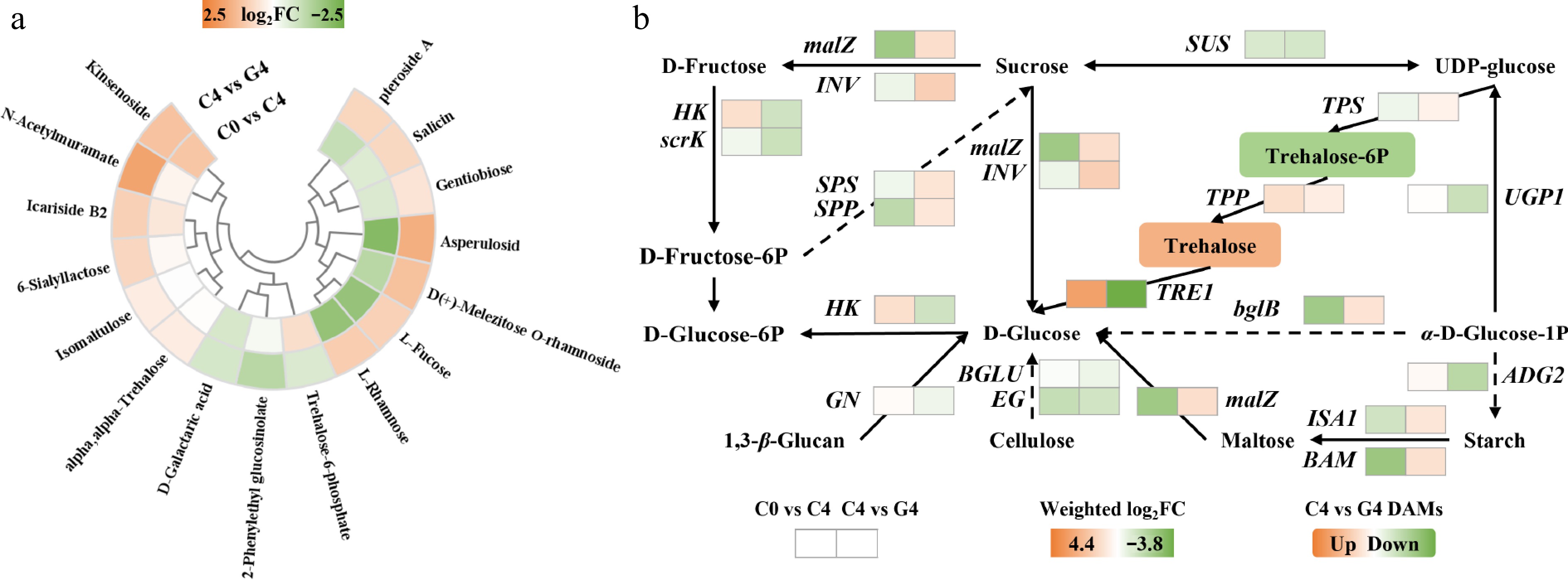 Effects of GABA treatment on carbohydrate metabolism in baby mustard during postharvest storage. (a) Heatmap of differentially accumulated carbohydrate metabolites. (b) Heatmap of transcript changes in genes involved in starch and sucrose metabolism pathway.