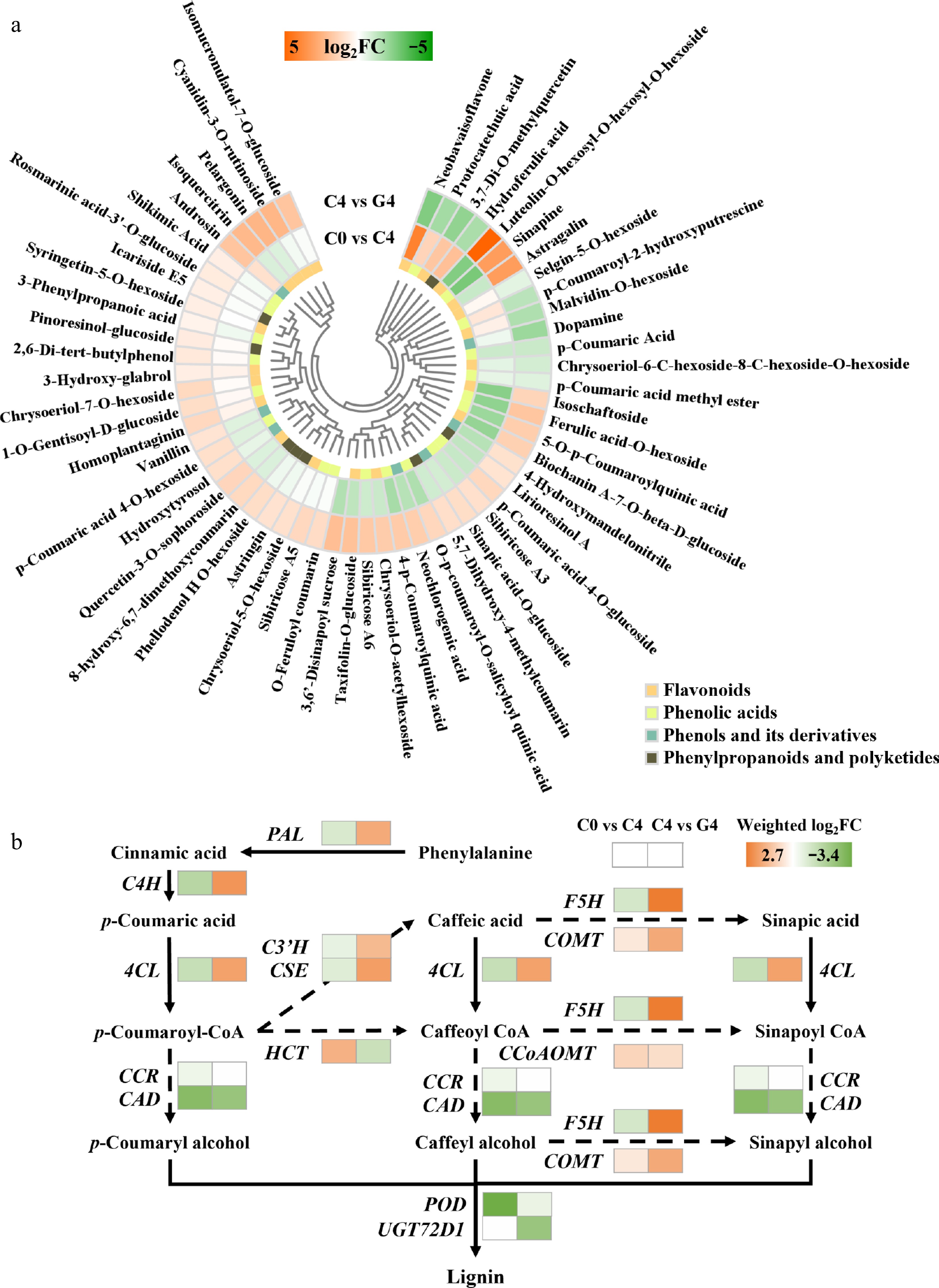 Effects of GABA treatment on phenylpropanoid metabolism in baby mustard during postharvest storage. (a) Heatmap of differentially accumulated phenylpropanoid-related metabolites. (b) Heatmap of transcript changes in genes involved in the phenylpropanoid biosynthesis pathway.