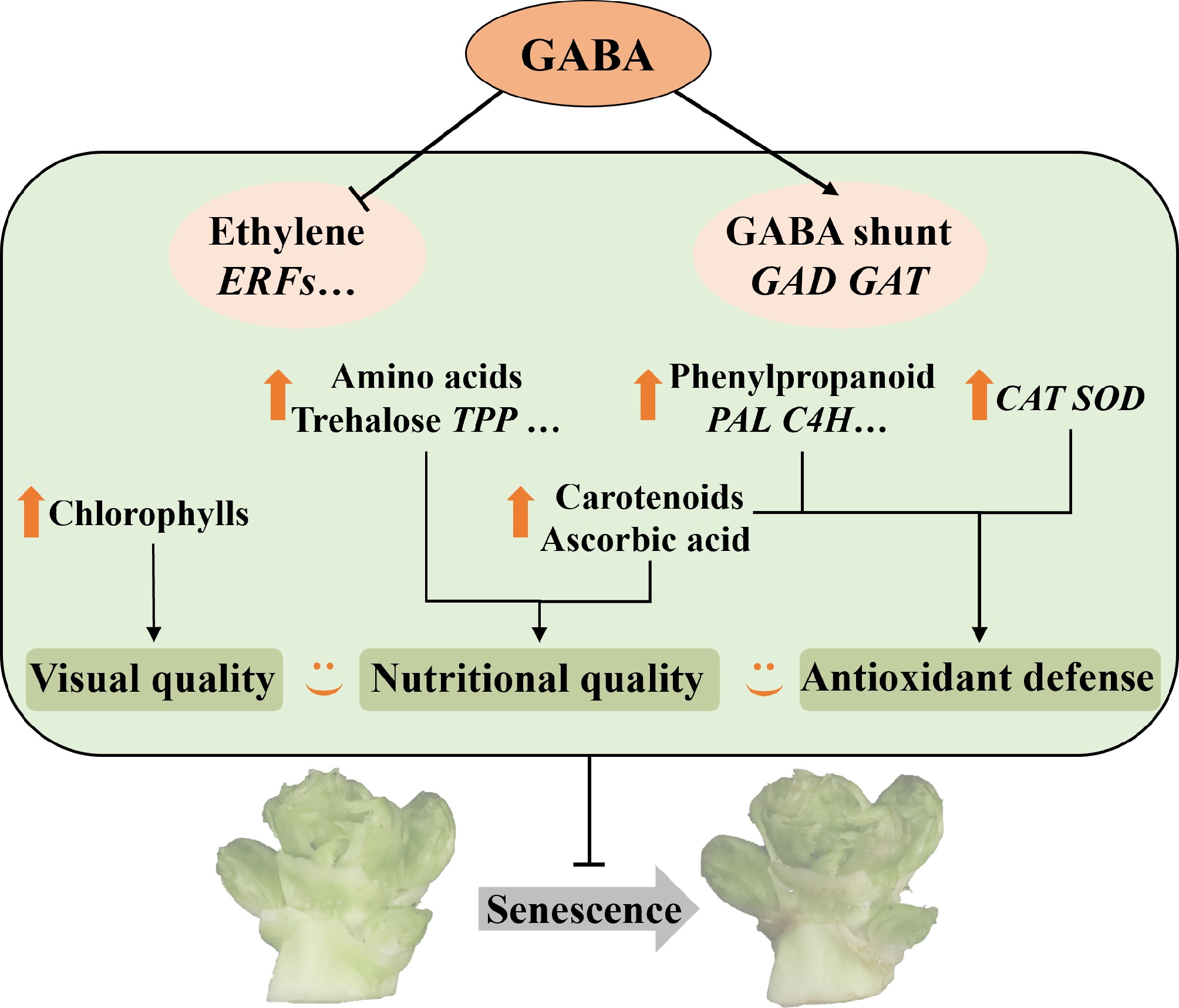 Proposed model for maintaining quality and the regulation mechanism induced by GABA in baby mustard after harvest.
