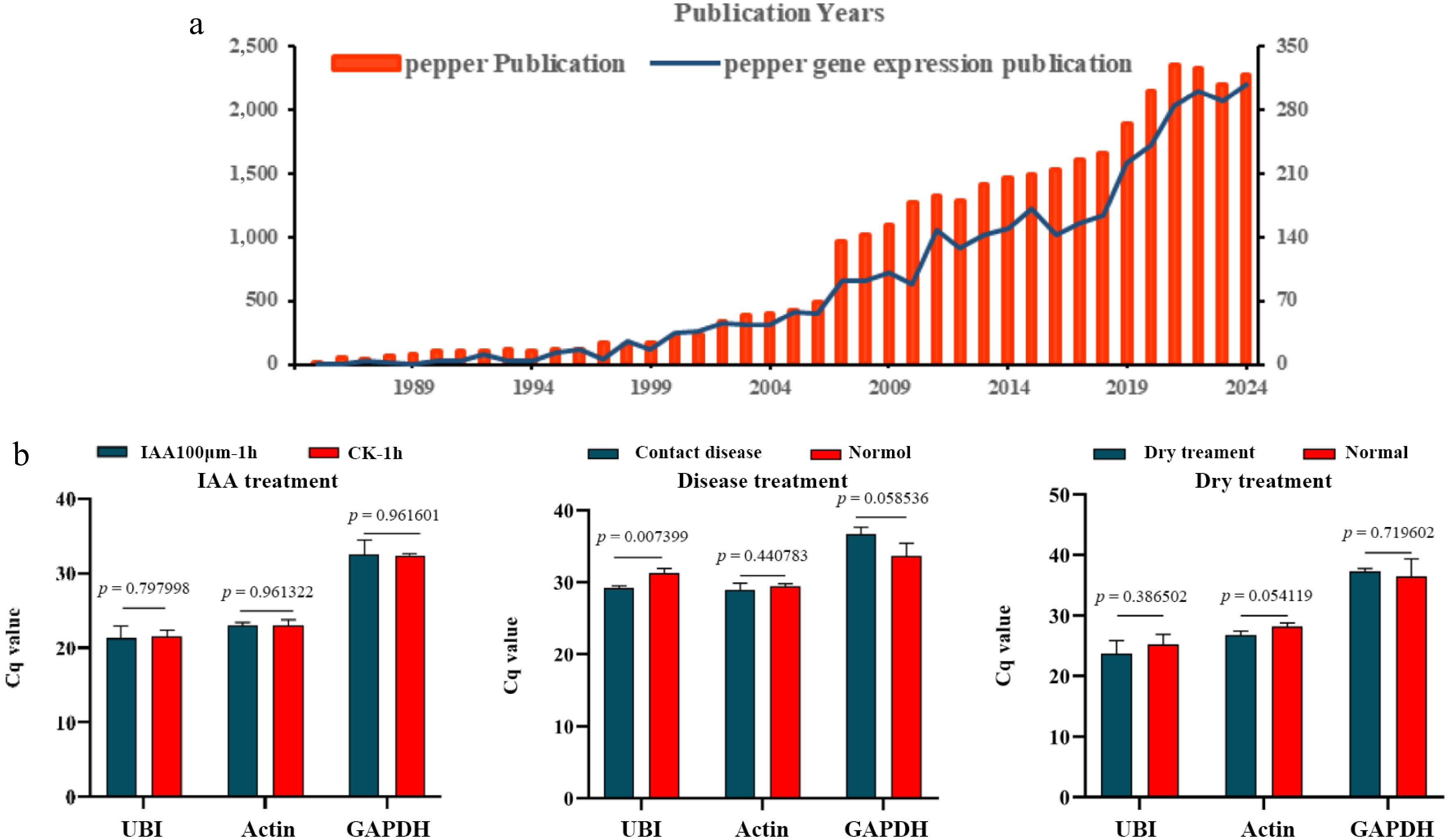 • In order to quickly understand the current status of pepper research, through the Web of Science database, the relevant literature on pepper and pepper gene expression analysis from 1988 to 2024 was retrieved. The corresponding number of documents for each year can be found in (Supplementary Table S1). Since 2007–2008, publications related to pepper have witnessed a rapid increase. Similar trends also exist in the publications related to gene expression among them (Fig. 1a). This might be the result of the synergy of the high-throughput sequencing technology iteration (the popularization of NGS (Next Generation Sequencing) represented by the Illumina platform), the integration of resources (International Program/Database), and the application pull around 2008, marking the entry of plant biology into a new era driven by big data[25]. By reviewing the research in recent years, some commonly used reference genes under hormone treatment, biotic, and abiotic stress were revealed (Table 1). The Cq value of the reference gene should be around 20. Meanwhile, the difference in Cq values of the reference gene among samples should not exceed one to ensure the stability of the expression level of the reference gene. The stability of the above genes was verified through RT-qPCR. The results showed that only the UBI or Actin gene was relatively stable. More obviously, under disease and drought conditions, the Cq values of commonly used reference genes showed significant differences. Notably, the commonly used reference gene GAPDH exhibited significantly higher Cq values under hormonal treatment and various stress conditions, rendering it unsuitable as a reliable internal control under these experimental conditions (Fig. 1b). Therefore, it is urgently necessary to screen and optimize the reference genes in pepper, especially under stress conditions.