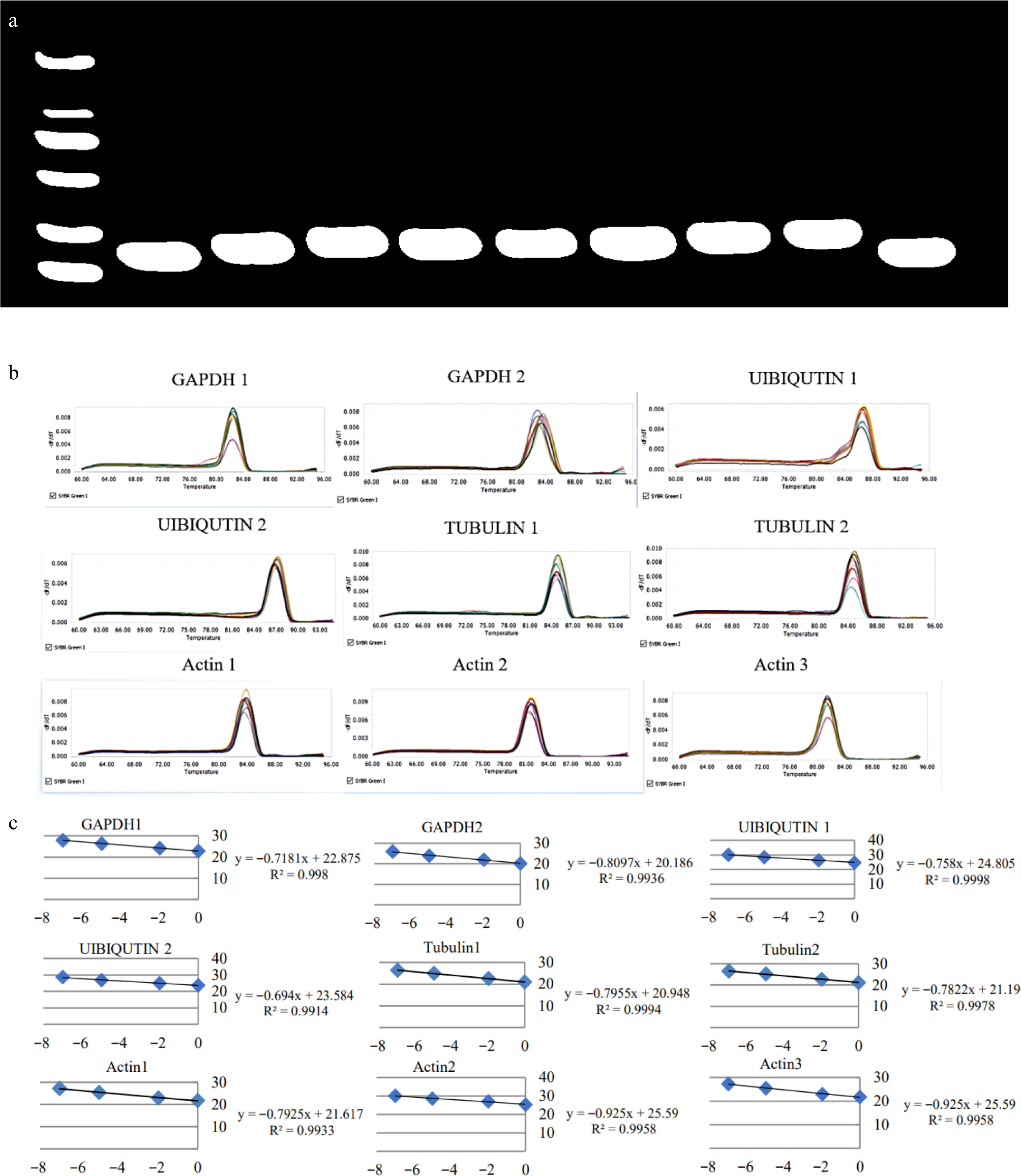 Specificity detection of nine pairs of primers. (a) The electrophoretic banding pattern of the amplification products of the nine reference genes. (b) The melting curve graphs of the nine reference genes. (c) Amplification efficiency of nine pairs of primers.