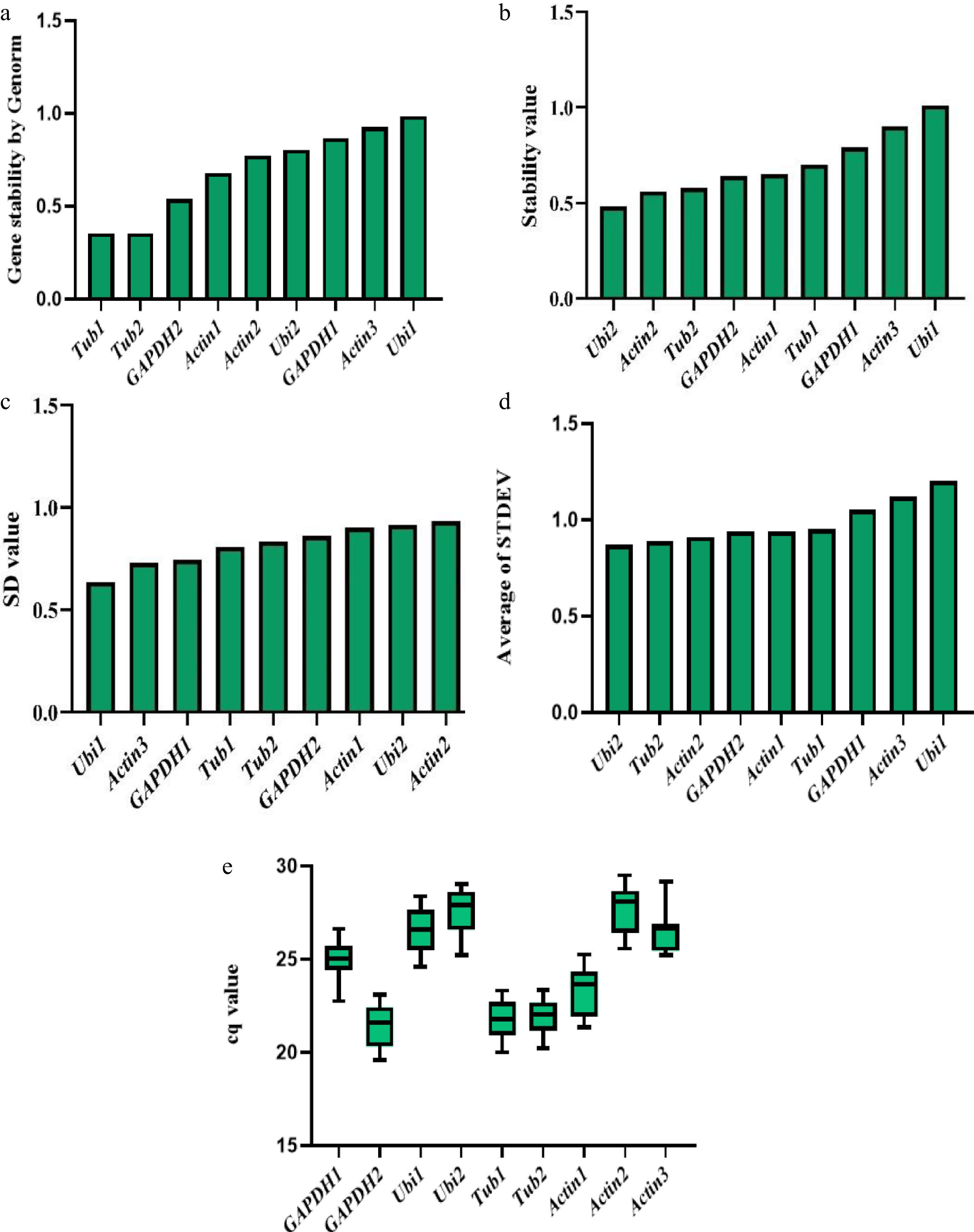 • In GeNorm, NormFinder, and BestKeeper software, the delta Ct value and average Cq value of each gene were used to analyse their expression stability. Finally, the stable and highly expressed candidate genes were screened via comprehensive evaluation.