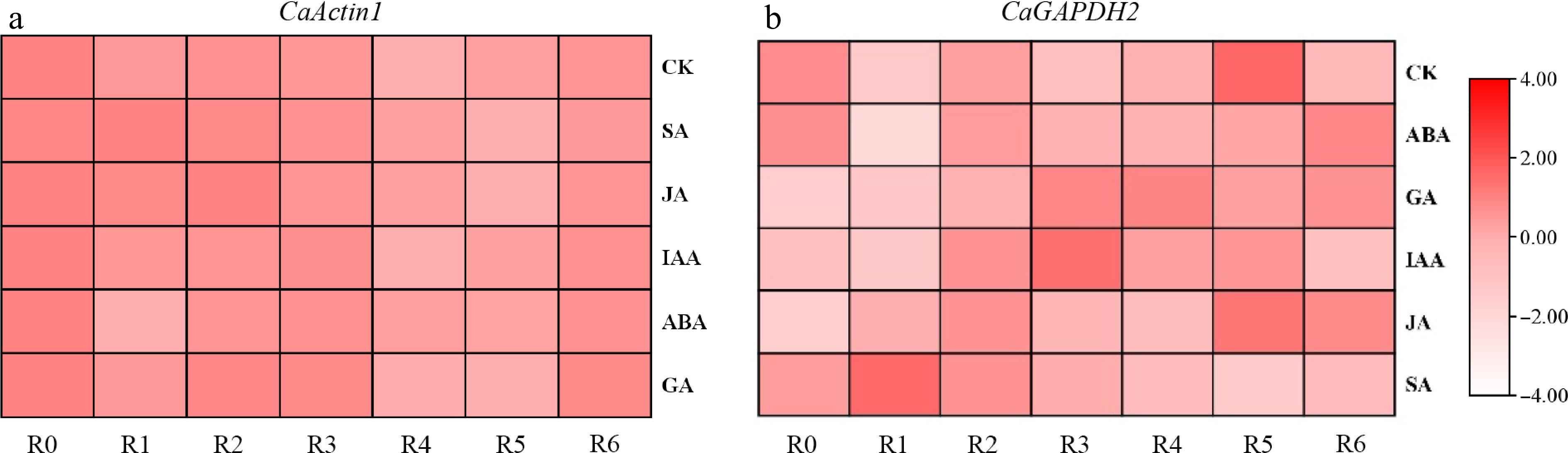 Analysis of expression stability of CaActin1 and CaGAPDH2 using published pepper data. (a) The expression of CaActin1 in roots under different hormone treatments. (b) The expression of CaGAPDH2 in roots under different stresses.