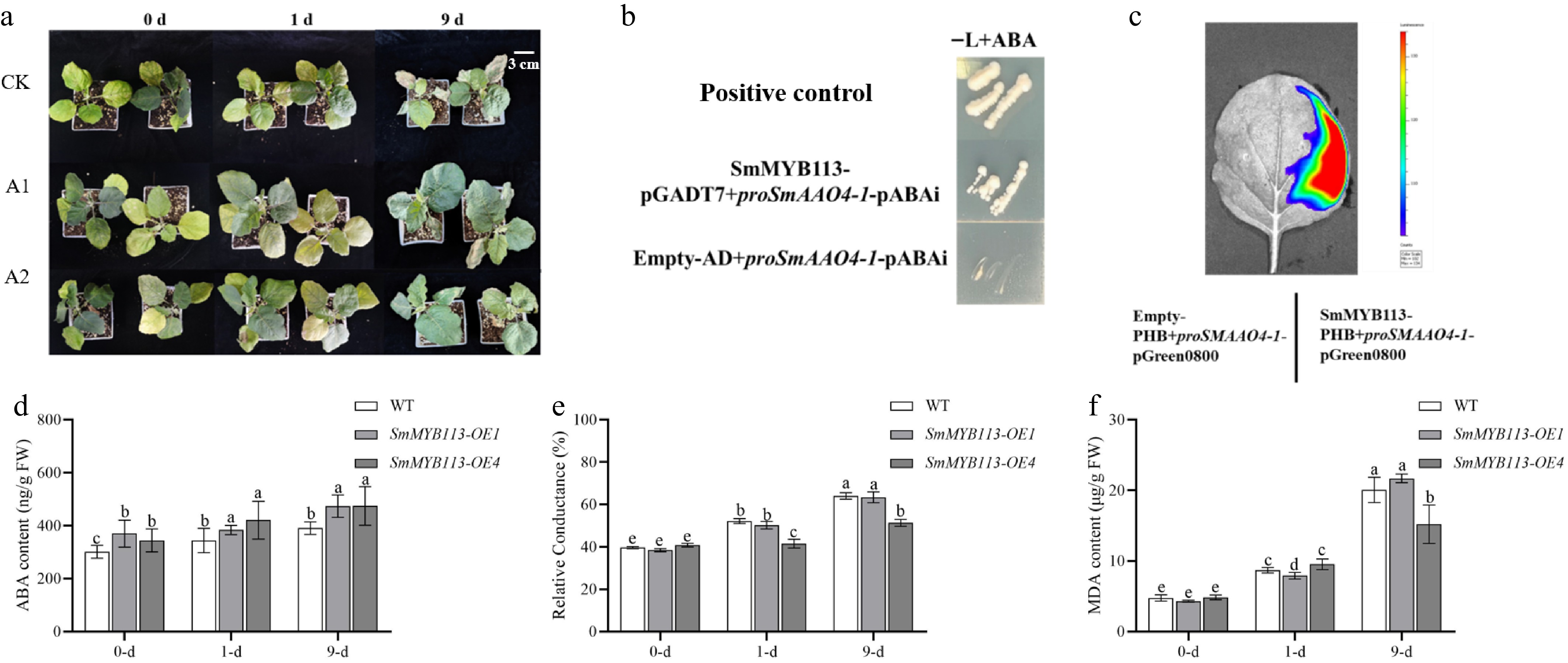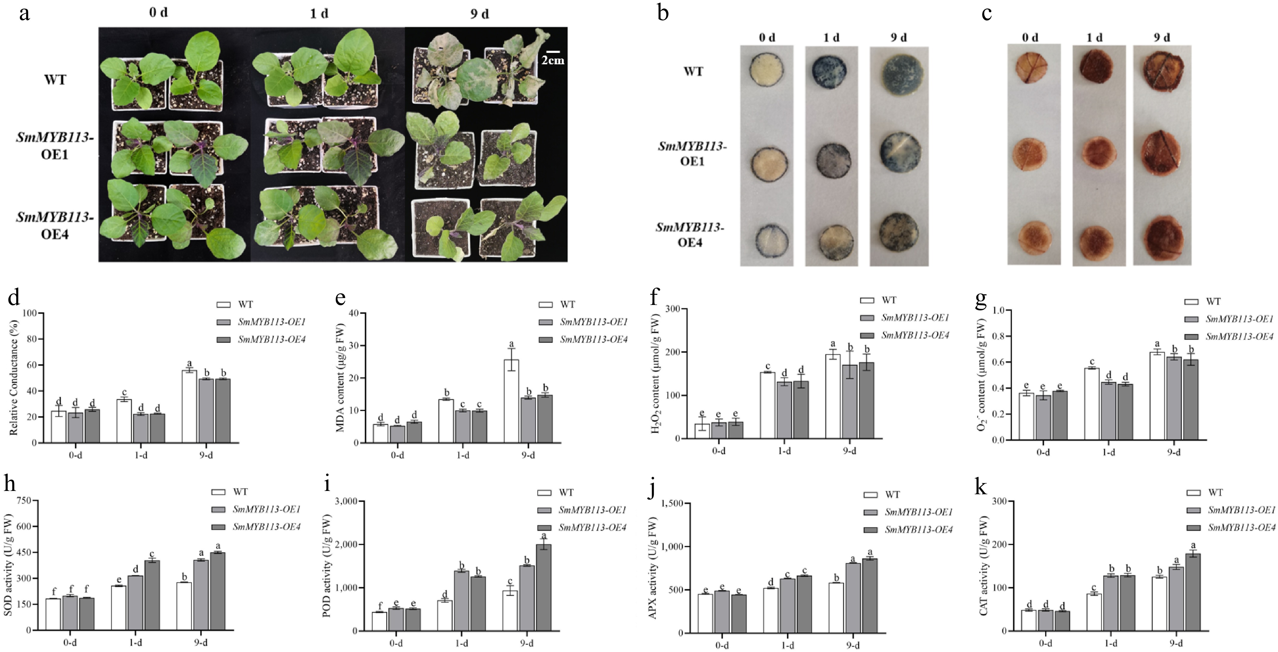 To study the regulatory relationship between SmMYB113 and ABA, ABA content was measured in OE1, OE4, and WT leaves at 1 and 9 d post-cold treatment. As shown in Fig. 3d, ABA content was significantly higher in OE1 and OE4 than in WT at 0 d. ABA levels increased in all lines at 1 and 9 d, but the increase was greater in OE lines. Compared to WT, ABA content in OE1 increased by 22.59%, 11.51%, and 21.26% at 0, 1, and 9 d, respectively. In OE4, it increased by 14.0%, 22.36%, and 21.56%. This indicates that SmMYB113 overexpression enhances ABA synthesis in transgenic lines.