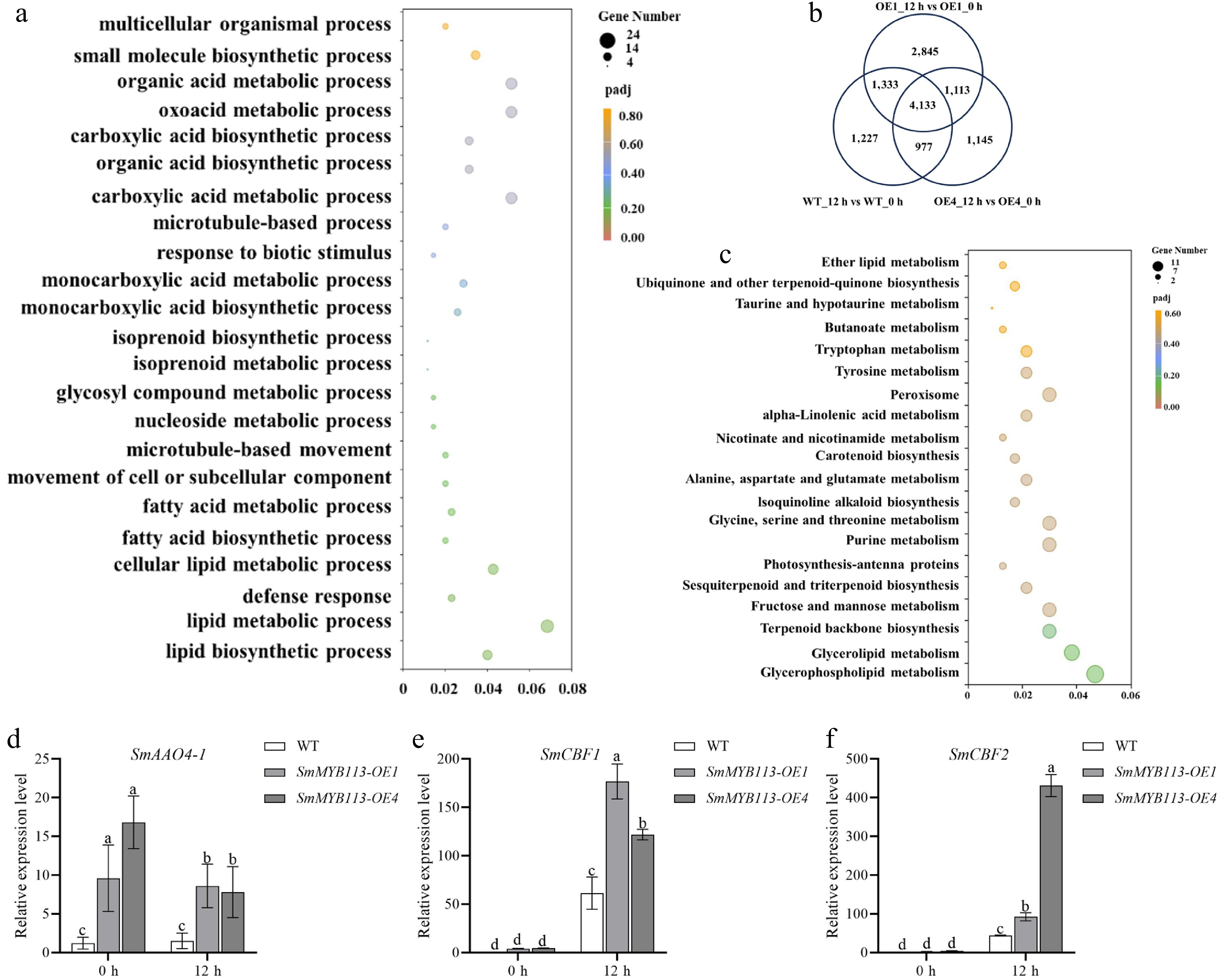Transcriptomic analysis reveals synergistic cold response pathways. (a) Gene Ontology (GO) enrichment analysis of the 1,113 DEGs common to OE lines but absent in WT. (b) Venn diagram of DEGs identified in WT, OE1, and OE4 plants under cold stress. (c) Kyoto Encyclopedia of Genes and Genomes (KEGG) pathway enrichment analysis of the 1,113 DEGs. (d)–(f) Expression levels of key genes in OE and WT plants under 5 °C (16 h light/8 h dark) at 0 and 12 h: (d) ABA biosynthetic gene SmAAO4-1, and cold response factors (e) SmCBF1, and (f) SmCBF2. Values represent means ± SD of three independent biological replicates (n = 3). Significant differences were determined by one-way ANOVA followed by Tukey's test (p < 0.05). Different lowercase letters indicate significant differences (p < 0.05).