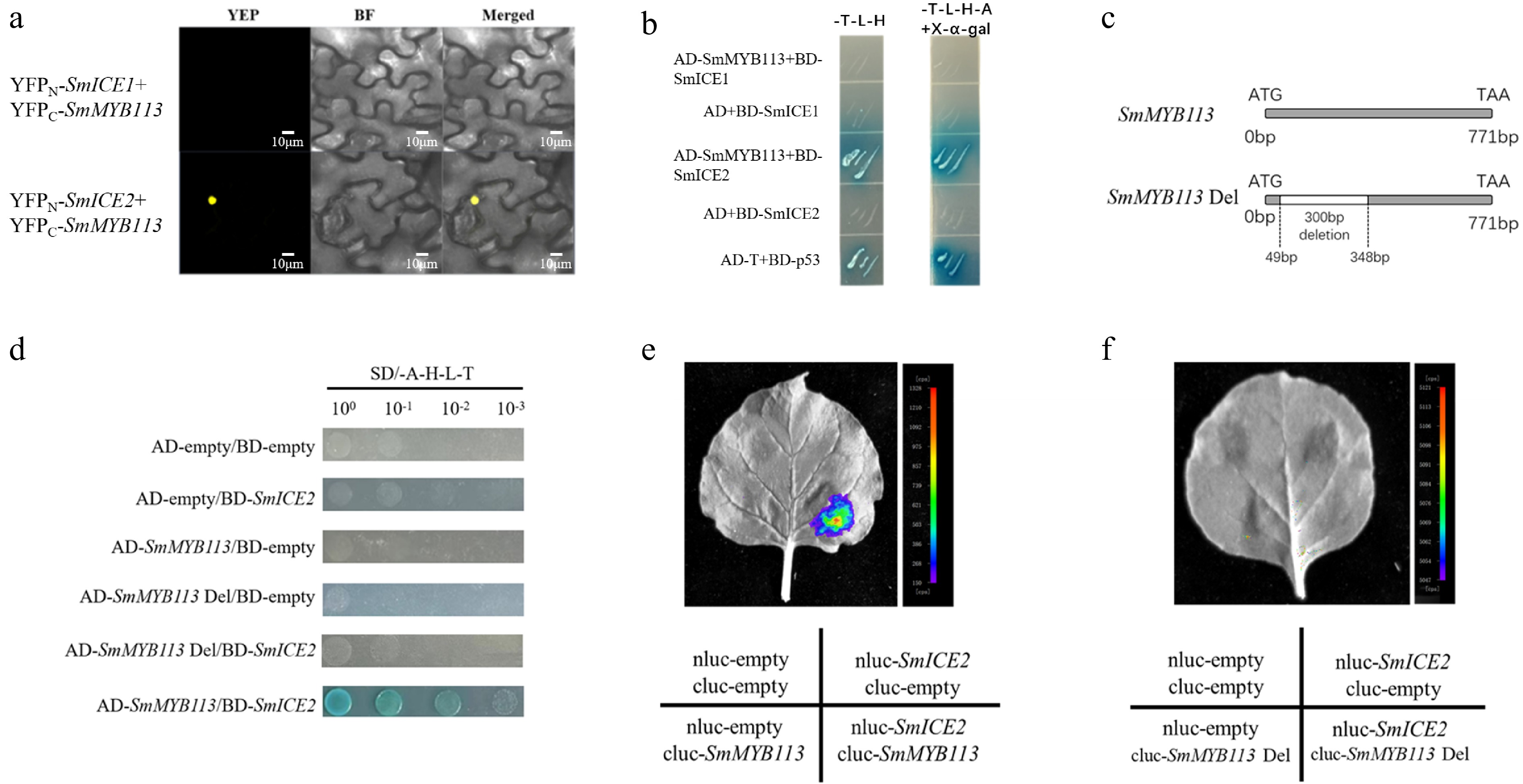 Validation of SmMYB113-SmICE2 interaction and identification of the interaction domain. (a) BiFC assay showing SmICE2-SmMYB113 interaction in tobacco leaf nuclei. SmICE1/YFPN and SmICE2/YFPN were paired with SmMYB113/YFPC. (b) Y2H assay confirming SmICE2-SmMYB113 interaction on SD/-T/-L/-H/-A medium. (c) Schematic diagram of SmMYB113 deletion mutant (SmMYB113Del, lacking residues 49−348). (d) Y2H assay showing loss of interaction between SmMYB113Del and SmICE2. (e) LCI assay showing strong fluorescence signal upon co-expression of full-length SmMYB113 and SmICE2. (f) LCI assay showing loss of fluorescence signal upon co-expression of SmMYB113Del and SmICE2.