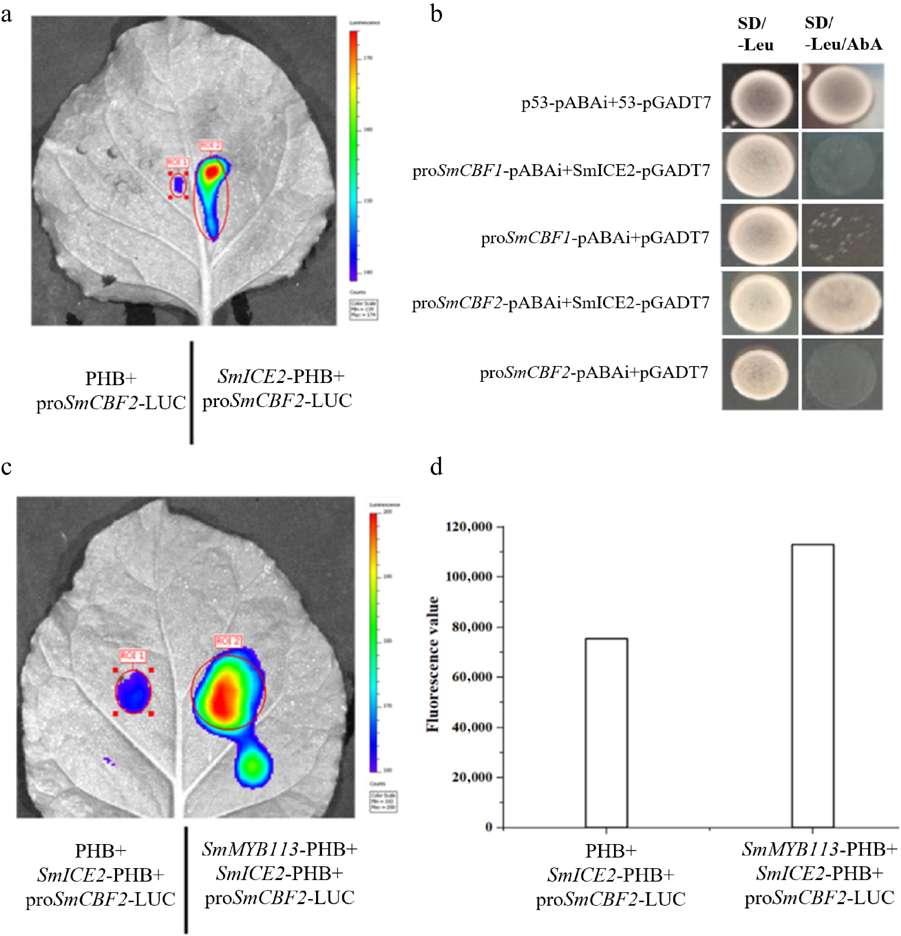 To validate SmICE2's ability to activate SmCBF transcription, SmICE2 was fused to the effector vector (pGreenII 62-SK), and the SmCBF2 promoter was fused to the reporter vector (pGreenII 0800-LUC). LCI assay (Fig. 5a) showed that SmICE2 binds the SmCBF2 promoter and activates luciferase expression. Y1H assay (Fig. 5b), with SmICE2-pGADT7 and proSmCBF2-pABAi, confirmed that SmICE2 activates SmCBF2 expression.