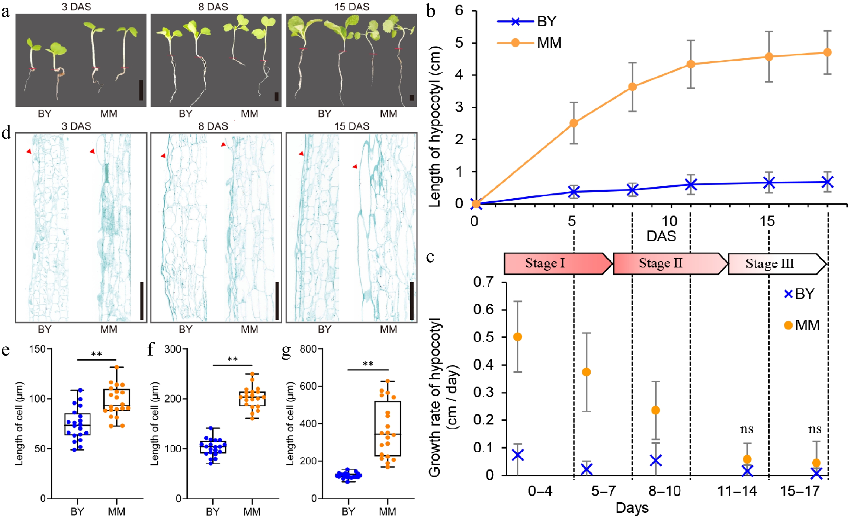 Phenotypic differences between turnip (MM) and Chinese cabbage (BY). (a) Images of MM and BY seedlings at 3, 8, and 15 DAS. Scale bars = 1 cm. The red lines indicate the boundary between root and hypocotyl. (b) Dynamic comparison of hypocotyl length between MM and BY. Seeds were germinated overnight at 25 °C and then planted in the greenhouse under LD (16 h light/8 h dark) conditions. The error bars indicate the SDs; at least 15 plants of each inbred line were used. (c) Stage-specific growth rate of the hypocotyl. Stages I, II, and III represent the fast elongation stage (0–7 d), elongation stage (8–13 d), and ending stage (14–18 d), respectively. The arrow indicates the deadline on the timeline of each stage. (d) Longitudinal sections of hypocotyl cells from MM and BY. A partial image of cells from the middle section of the hypocotyl is shown. The red arrows indicate the epidermis. Scale bars = 500 µm. (e)–(g) Length of hypocotyl cells at (c) 3, (d) 8, and (e) 15 DAS. Significance level: ** p < 0.01.
