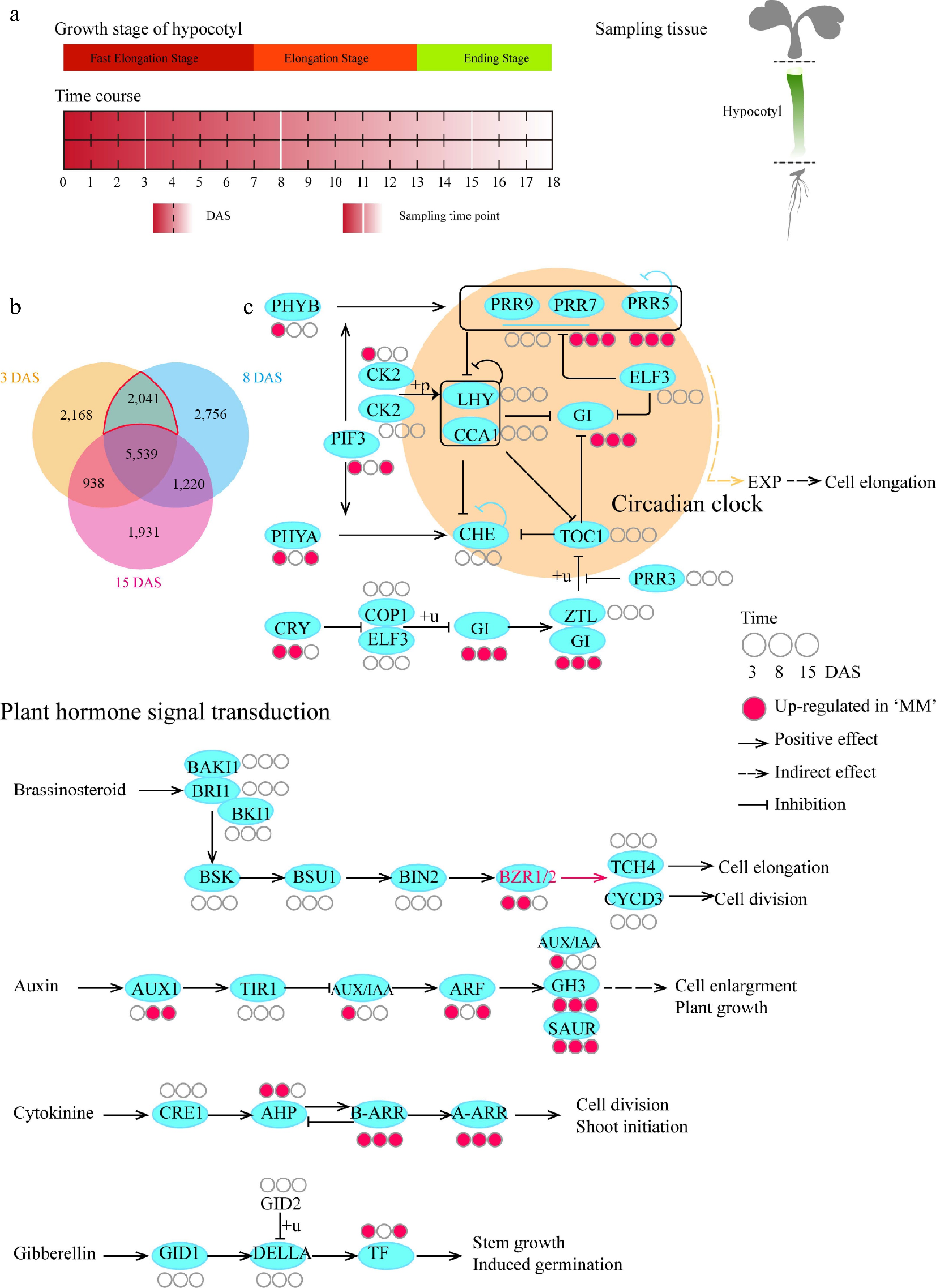 Comparative temporal transcriptome analysis of hypocotyls between MM and BY. (a) Design of the transcriptome analysis. Seeds (MM and BY) were germinated overnight at 25 °C and planted in the greenhouse under LD conditions. Sampling was conducted for each line at 3, 8, and 15 DAS, covering the abovementioned three stages of hypocotyl growth. Tissue was sampled from the whole hypocotyl. For each line, three biological replicates at each time point were used. Each replicate contained material from at least 15 plants. (b) Venn diagram of DEGs. DEGs between MM and BY at 3, 8, and 15 DAS are shown in specific colors. The red line encircles the DEGs during the hypocotyl elongation stages. The upregulated and downregulated genes are not displayed separately. (c) KEGG enrichment analysis of the upregulated genes in the circadian rhythm and BR signaling pathways in turnip. The original maps showing the results of KEGG enrichment analysis are shown in Supplementary Table S1.