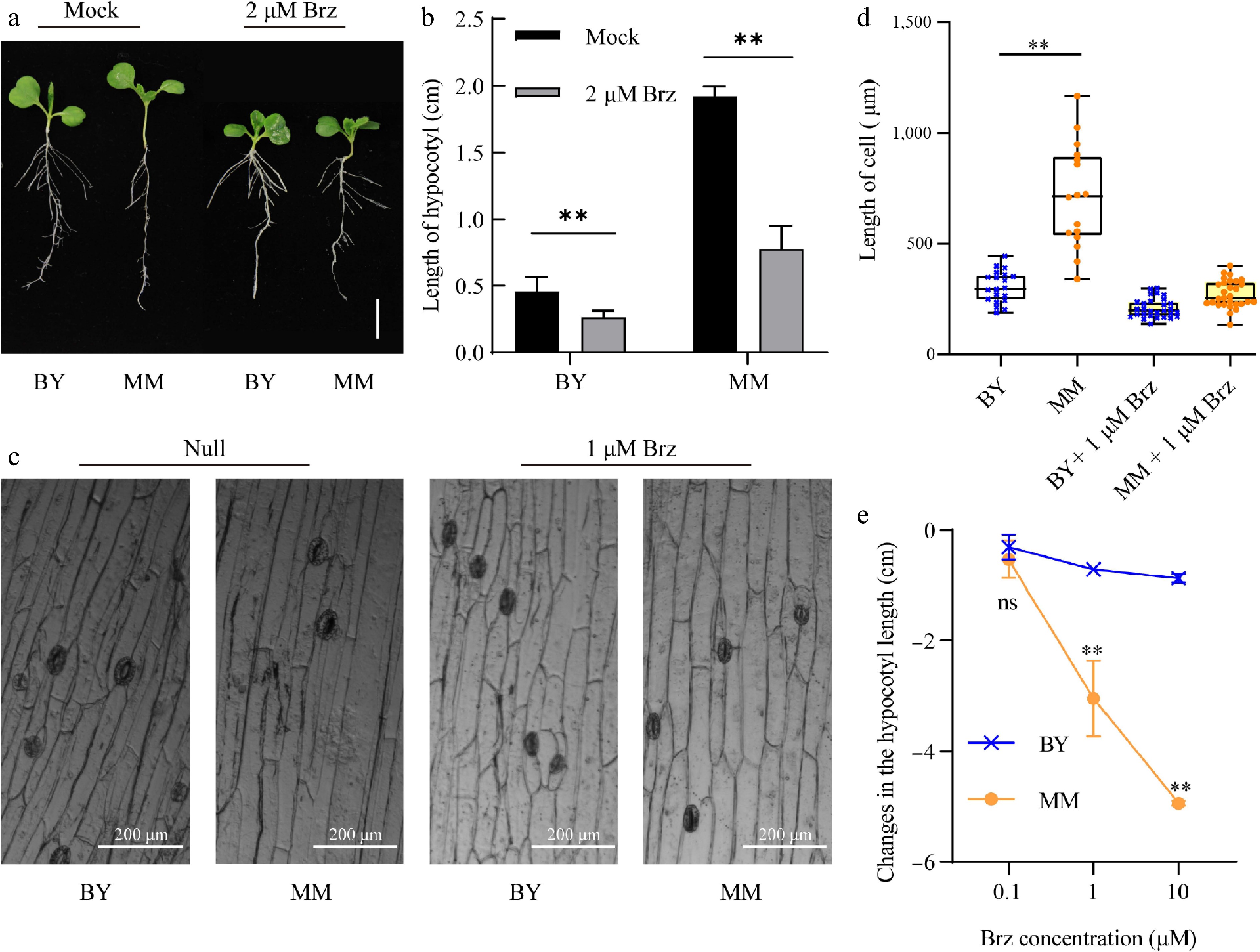 Brz represses hypocotyl growth and hypocotyl cell elongation in MM and BY. (a) Morphological changes in MM and BY in response to Brz. Seeds were germinated on ½ MS culture medium supplemented with 2 µM Brz or control (mock) for 10 d under LD conditions. Bar = 1.9 cm. (b) Changes in the hypocotyl length of MM and BY in response to Brz. Seeds were germinated on ½ MS culture medium supplemented with 2 µM Brz or control medium (mock) for 10 d under LD conditions. The error bars indicate the SDs; n = 6. Significance level: ** p < 0.01. (c) Visualization of epidermal cells in the hypocotyls of MM and BY treated with Brz. (d) Changes in the epidermal cell length in the hypocotyls of MM and BY in response to Brz. Significance level: ** p < 0.01. (e) Changes in the hypocotyl lengths of MM and BY under treatment with gradient concentrations (0.1, 1, and 10 µM). The error bars indicate the SDs; n = 6.