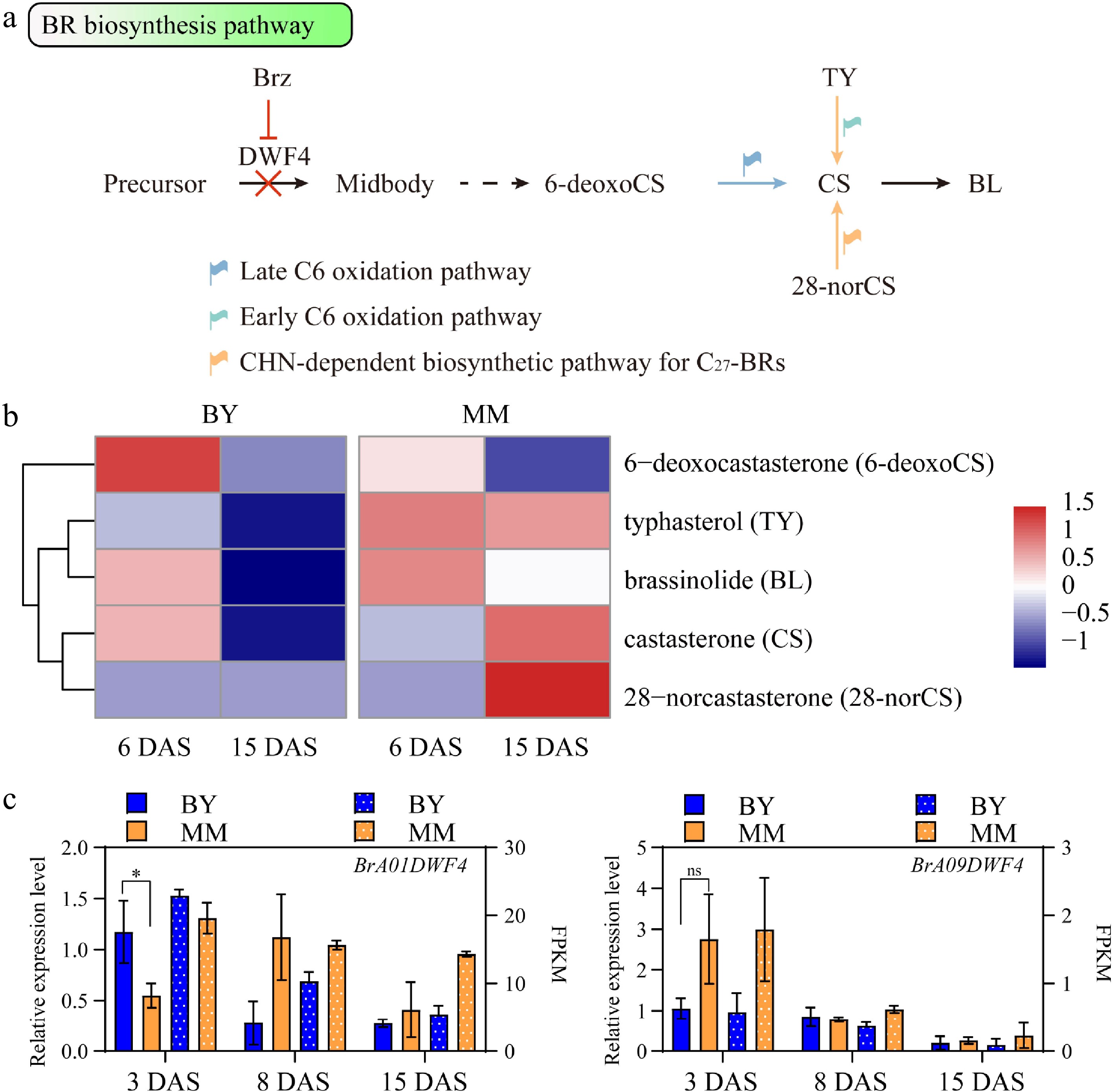 Comparison of the BR biosynthesis pathway between MM and BY. (a) BR biosynthesis pathway in plants. The likely preferential pathways in MM and BY are indicated by orange and blue arrows, respectively. The dashed arrow indicates more than one step. (b) Heatmap of the BR concentrations in the hypocotyls of MM and BY at 6 and 15 DAS. (c) Expression levels of BrA01DWF4 and BrA09DWF4 determined via qRT‒PCR and RNA-seq in the hypocotyl of B. rapa at 3, 8, and 15 DAS. Significance level: * p < 0.05 by an unpaired t test; ns p value > 0.05 by an unpaired t test.