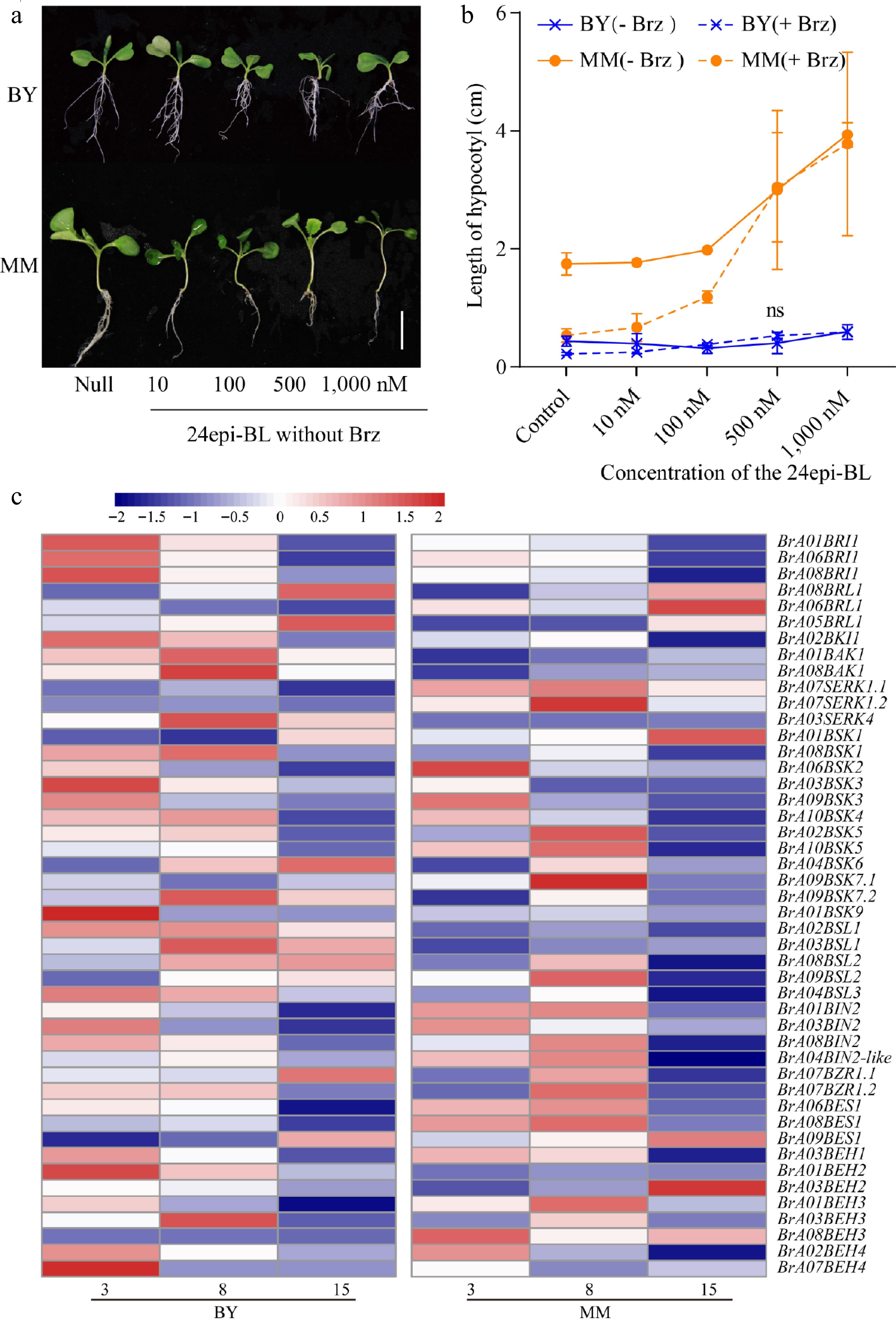 The response of MM to BR signaling is stronger than that of BY. (a) Morphological changes in MM and BY in response to 24epi-BL. Seeds were germinated on ½ MS culture medium supplemented with gradient concentrations of 24epi-BL (10, 100, 500, and 1,000 nM) and untreated medium (blank application) under LD conditions for 10 d. Bar = 1.9 cm. (b) Measurement of hypocotyl elongation in MM and BY seedlings under treatment with BL with or without Brz. Seeds were germinated on ½ MS culture medium (containing 0 or 1 µM Brz) supplemented with gradient concentrations of 24Epi-BL (10, 100, 500, and 1,000 nM) under LD conditions, and the hypocotyl length was measured at 10 DAS. At least five seedlings were used per replicate. The error bars indicate the SDs; n = 3. (c) Heatmap of the transcript levels of BR signaling pathway genes in the hypocotyls of MM and BY at 3, 8, and 15 DAS.