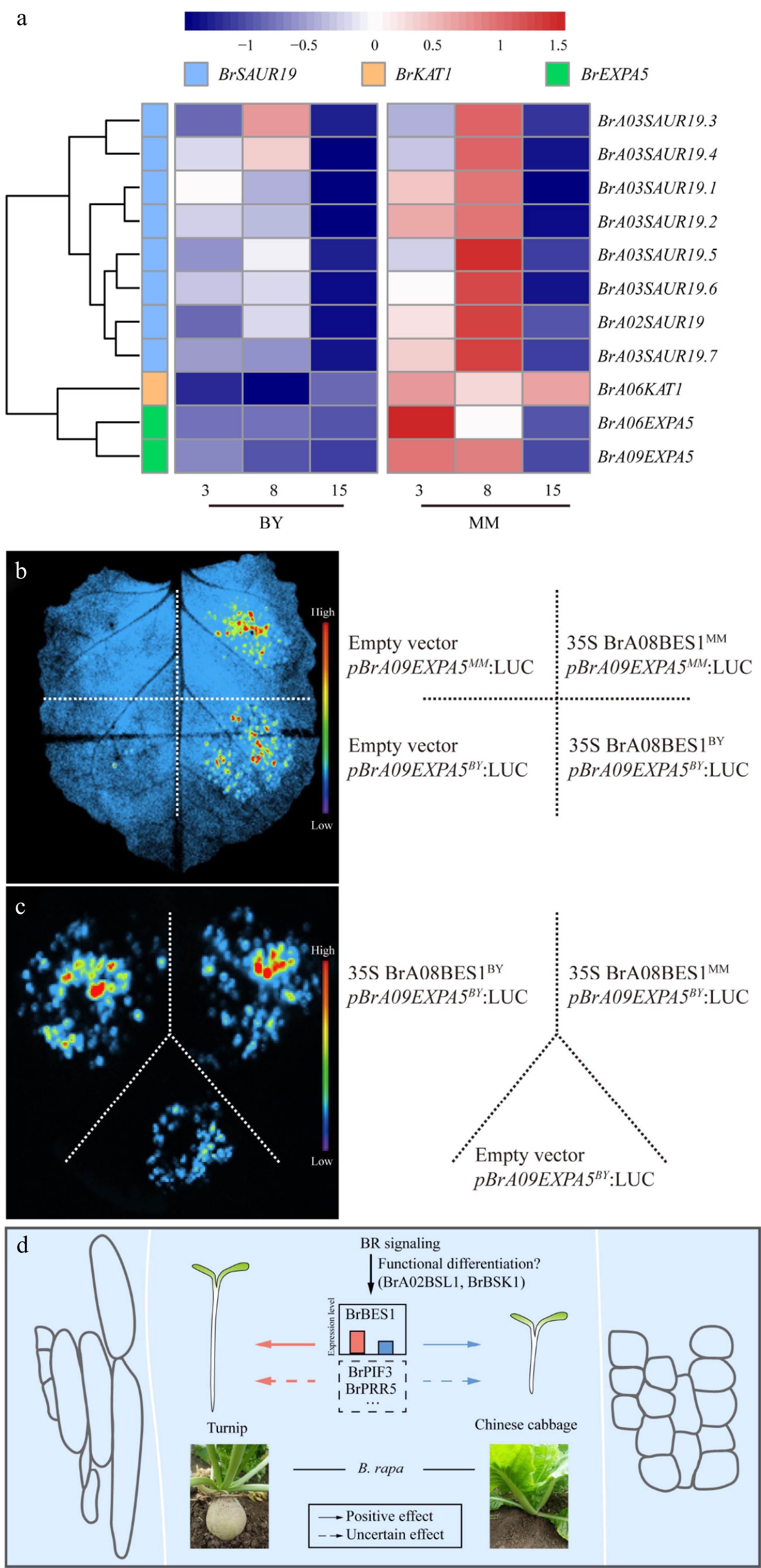 BR signaling transcription factors activate the transcription of cell expansion genes, which are specifically expressed during hypocotyl elongation in MM and BY. (a) Heatmap of the transcript levels of the cell expansion genes in the hypocotyls of MM and BY at 3, 8, and 15 DAS. (b) BrA08BES1 activates the transcription of the gene BrA09EXPA5 in N. benthamiana epidermal cells, as shown by an effector–reporter-based transactivation assay. The empty vector and pBrA09EXPA5 were injected as negative controls. (c) BrA08BES1BY and BrA08BES1MM activate the transcription of the gene BrA09EXPA5BY. The empty vector and pBrA09EXPA5BY were injected as negative controls. (d) BR signaling pathway differences contribute to the variation in hypocotyl elongation between turnip and Chinese cabbage.