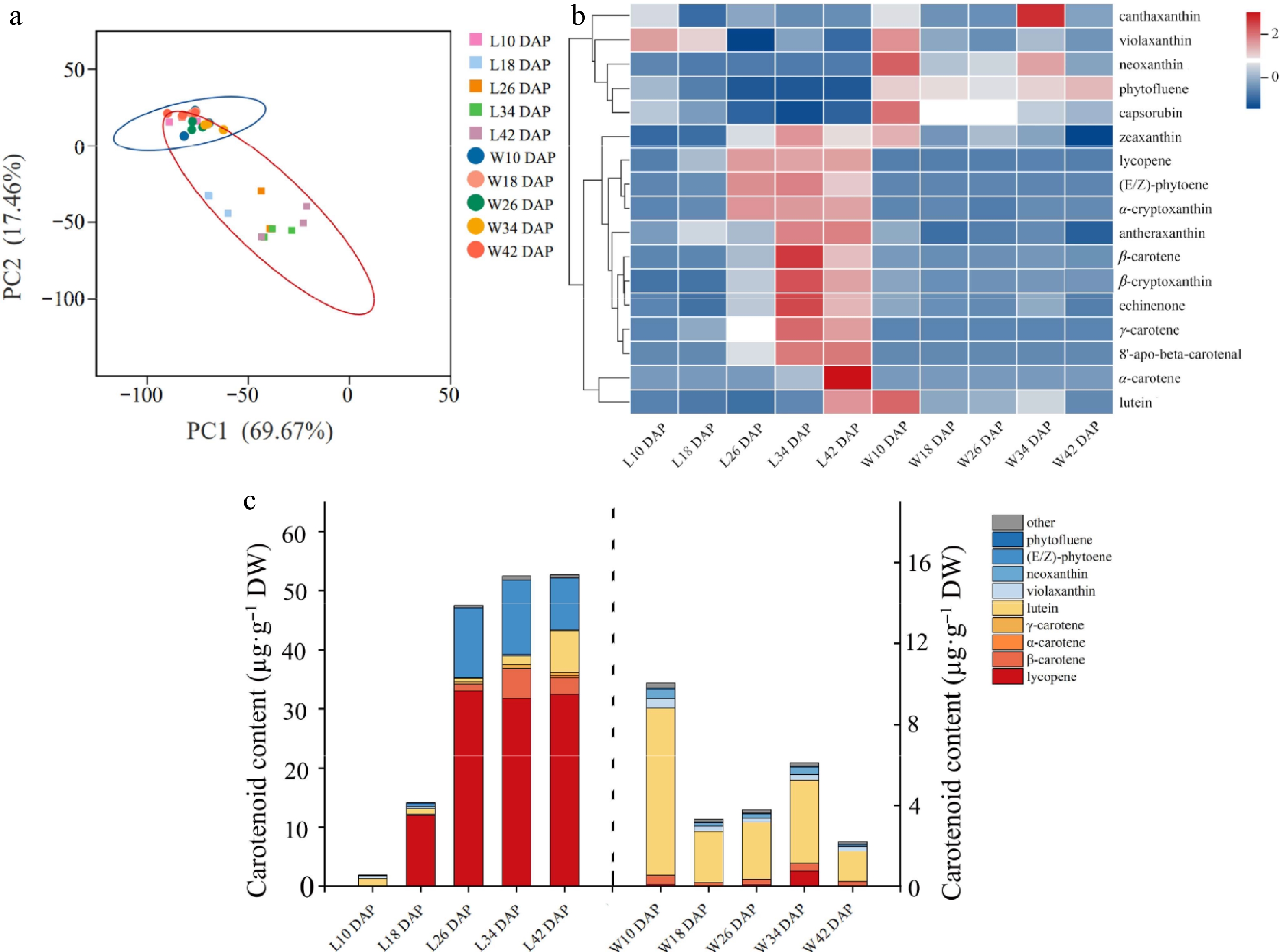 Carotenoid accumulation and developmental patterns of chromoplast in red- and white-fleshed watermelons. (a) Main component analysis of carotene. The cube with five colors indicates the flesh of LSW-177 at 10, 18, 26, 34, and 42 d after pollination, covered by a red oval. The five colored circles indicate the flesh of W1-60 at 10, 18, 26, 34, and 42 d after pollination, covered by a blue oval. The data was processed log2 (N). (b) Cluster analysis of carotene: the data have been standardized by Z-score processing. (c) Carotenoid composition analysis: the content of carotenoid in fruit of L10, L18, L26, L34, and L42 DAP is shown on the left Y axis, and the content of carotenoid in fruit of W10, W18, W26, W34, and W42 DAP is shown on the right Y axis.
