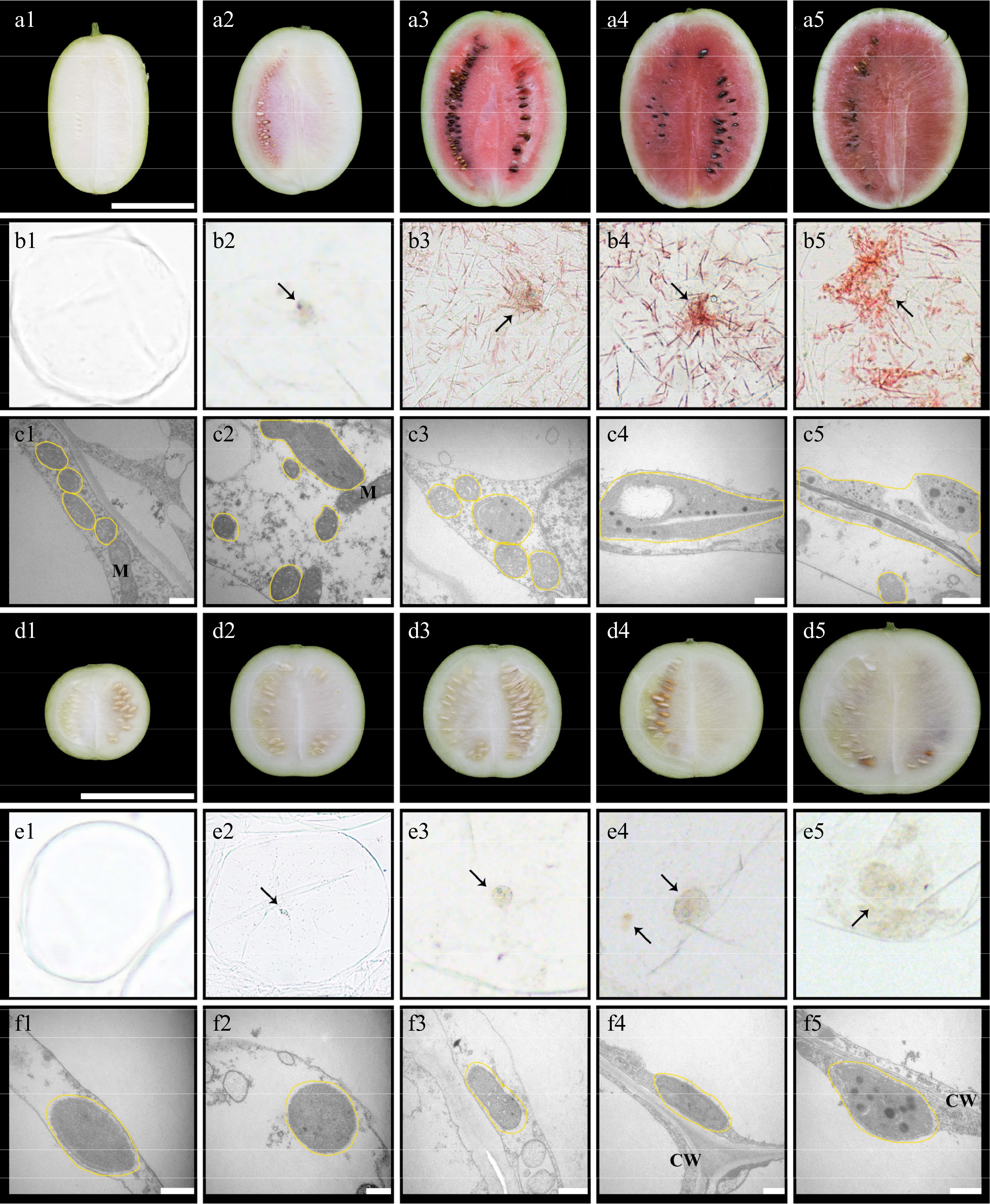 Cytological observation of chromoplast in the flesh of watermelons (LSW-177 and W1-60). The letters (a)–(c) are the longitudinal section, cell microstructure, and cell sub-microstructure of the fruit of LSW-177, respectively; the letters (d)–(f) are the longitudinal section, cell microstructure, and cell sub-microstructure of the fruit of W1-60, respectively. The scale of (a) and (d) is 10 cm, and the scale of (c) and (f) is 0.5 µm. The numbers (1), (2), (3), (4), and (5) after the letters represent 10, 18, 26, 34, and 42 DAP, respectively. The black arrow points to the chromoplast, the yellow line represents the plast. M: mitochondria; CW: cell wall.