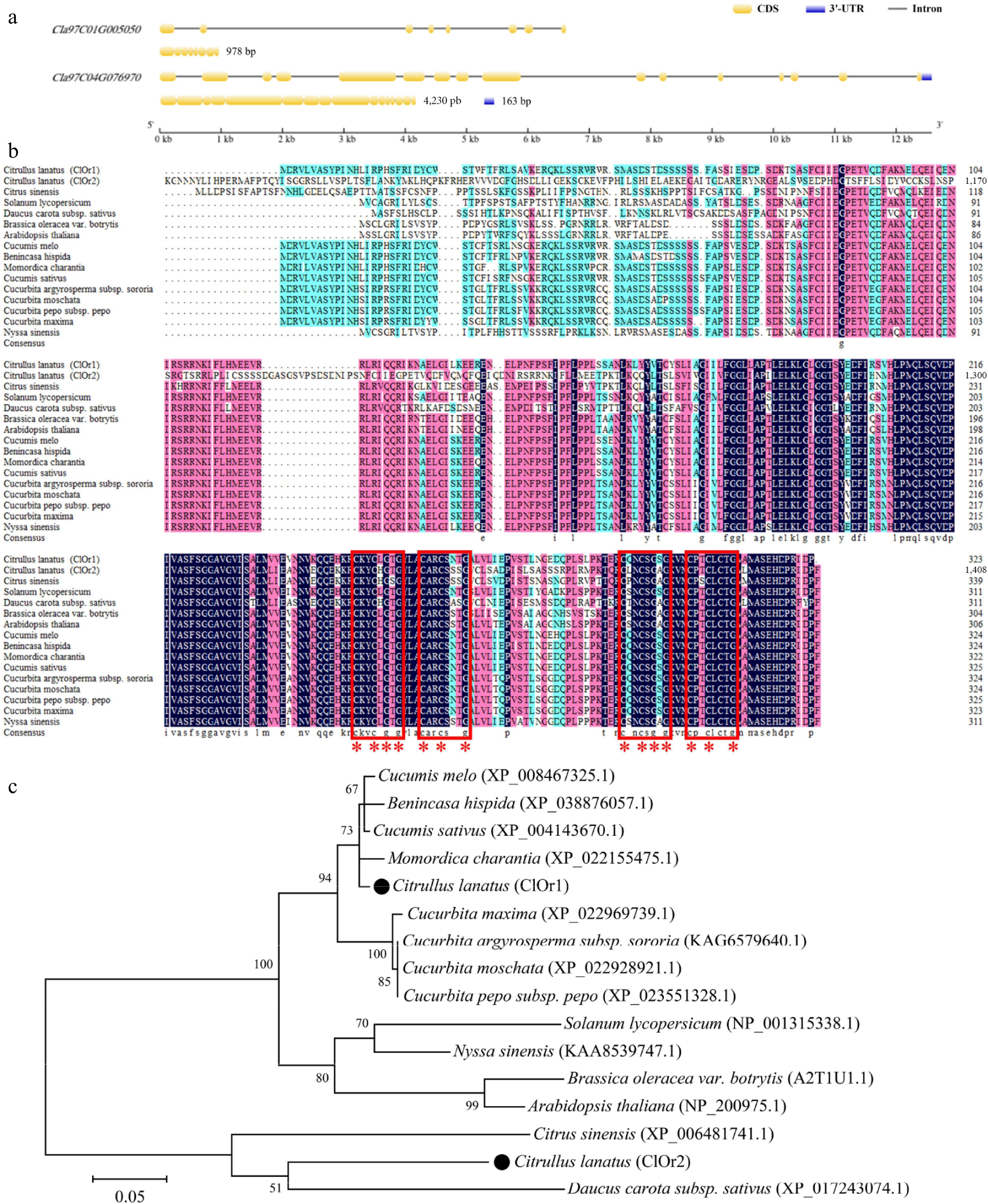 Sequence alignment and phylogenetic analysis of ClOr. (a) Structure of the ClOr1 and ClOr2 genes. (b) Sequence analysis of the Or protein. The red box marks two (CxxCxGxG) motifs and two (CxxCxxxG) motifs, and the red '*' marks eight cysteine and six glycine residues that are highly conserved. (c) Phylogenetic tree of the Or protein. The bar indicates an evolutionary distance of 0.05%.