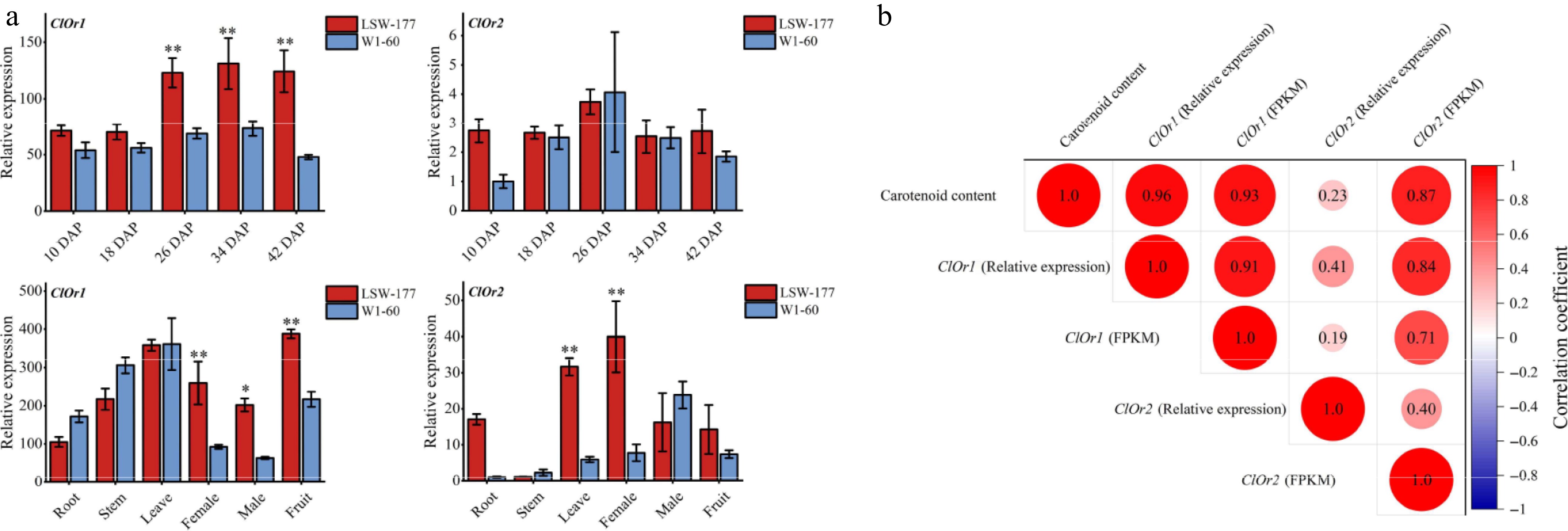 Expression analysis of the ClOr gene in watermelons. (a) Expression analysis of the ClOr gene in red- and white-fleshed watermelon. Each data point represents the mean of three biological replicates, the error bar represents the mean ± standard error value, * significant difference, p < 0.05; ** p < 0.01 (two-tailed). (b) Correlation analysis between the ClOr gene expression and carotenoid content. Relative expression refers to the fluorescence quantitative data of the ClOr gene in LSW-177 and W1-60 materials at different developmental stages, and FPKM refers to the RNA-Seq data of the ClOr gene in LSW-177 (PRJNA338036) and W1-60 at different developmental stages. The number in the circle pattern is the Pearson correlation coefficient (two-tailed), respectively.