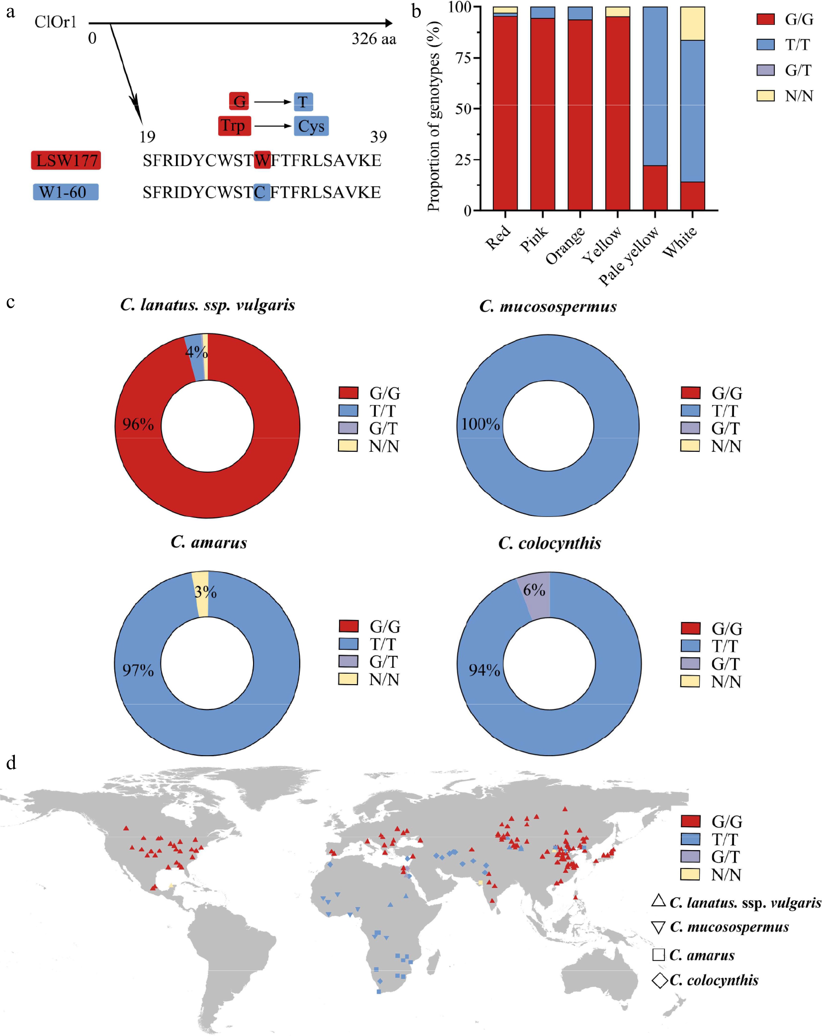 A single SNP variation in the ClOr1 gene can affect the formation of watermelon flesh color. (a) Sequence variation of ClOr1 protein between LSW-177 and W1-60. A non-synonymous mutation from guanine (G) to thymine (T) at the 29th amino acid of ClOr1 resulted in an amino acid variation from tryptophan (Trp) to cysteine (Cys). (b) Genotype proportions of watermelons with different flesh colors (red, pink, orange, yellow, pale yellow, white). The red sections represented the G/G genotype identical to LSW-177, the blue sections represented the T/T genotype identical to W1-60, the purple sections represented the G/T genotype, and the orange sections represented unknown. (c) Genotype of 406 watermelon accessions using a doughnut chart. (d) Geographical distribution of genomic variations in the ClOr1 gene of 428 watermelon accessions. C. lanatus, ssp. vulgaris was represented by an upright triangle, C. mucosospermus was represented by an inverted triangle, C. amarus was represented by a square, and C. colocynthis was represented by a rhombus.