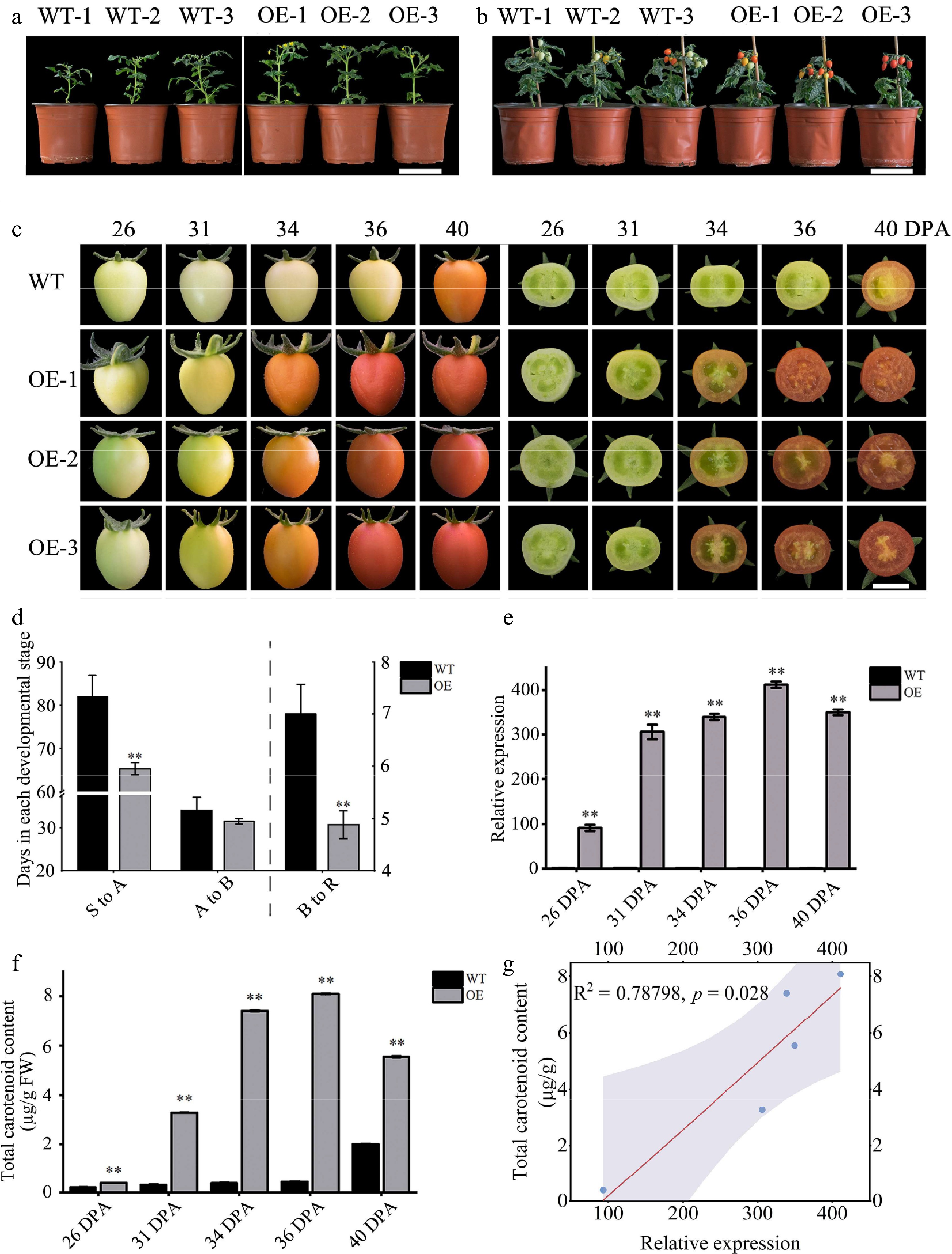 Phenotypic and gene expression analysis of WT and OE tomatoes. (a) First flowering state of tomato plants, scale = 10 cm. (b) Fruit development status of tomato plants, scale = 10 cm. (c) Tomato fruit phenotype, scale = 1 cm. (d) Number of days required for each developmental period in tomato fruit; see the left Y axis for (S to A) and (A to B), and the right Y axes for (B to R). (e) The expression level of the ClOr1 gene in fruits at different ripening stages, in which the expression level of the 26 DPA fruit of WT tomato was used for calibration. (f) Total carotenoid content in fruits at different ripening stages. In (d)–(f), each data point represents the mean of three biological replicates, the error bar represents the mean ± standard error value, ** significant difference between the WT and OE tomatoes, p < 0.01 (two-tailed). (g) Correlation analysis between the ClOr1 gene expression and total carotenoid content.