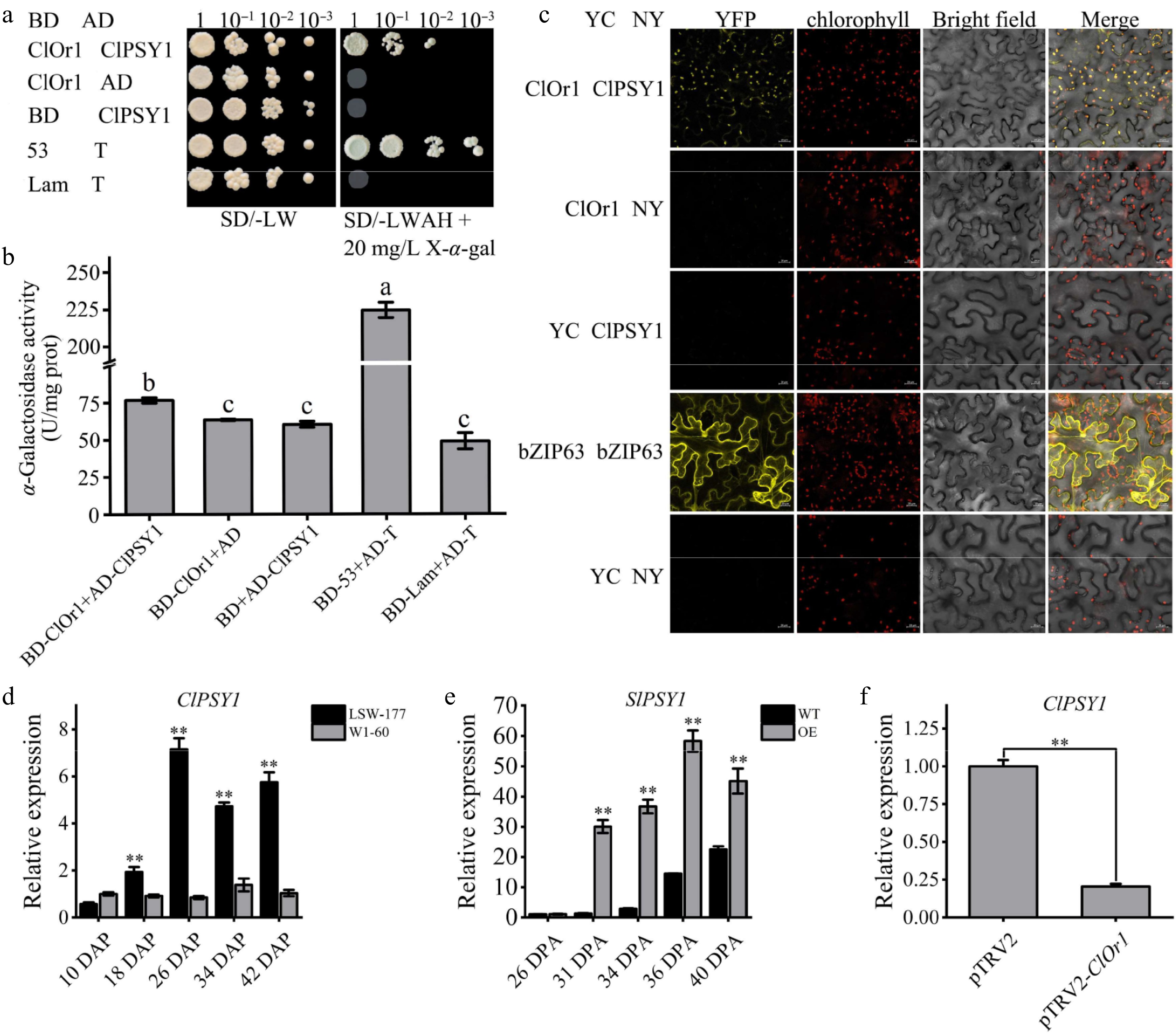ClOr1 interacted with ClPSY1. (a) Y2H assays. Growth of co-transformed yeast on non-selective SD/-LW medium and selective SD/-LWAH medium. Positive control BD-53 + AD-T (pGBKT7-53 + pGADT7-T), negative control BD-Lam + AD-T (pGBKT7-Lam + pGADT7-T). (b) α-Galactosidase activity detection. U/mg prot, unit enzyme activity, is 1 nmol p-nitrophenol per mg histone per hour. The results of the one-way analysis of variance were indicated by different lowercase letters (p < 0.05). (c) BiFC assays. YFP: yellow fluorescent channels; Bright field: chloroplast spontaneous fluorescent channels; Merge: superposition field. YC-bZIP-63 + NY-bZIP-63 and YC + NY were used as positive control and negative control, respectively. (d), (f) Expression analysis of the ClPSY1 gene in watermelons. (e) Expression analysis of the SlPSY1 gene in tomato fruits at different ripening stages. Bar data are the means of three biological replicates ± standard error value, * p < 0.05; ** p < 0.01 (two-tailed).