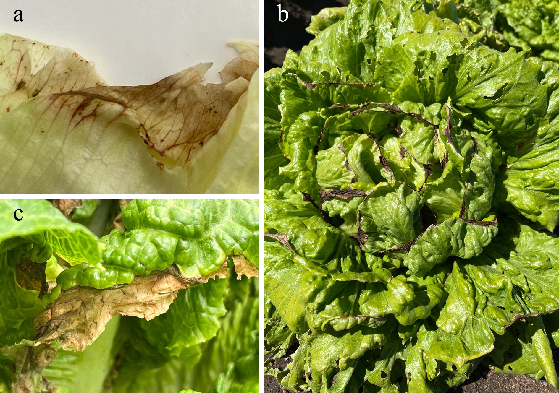 Tipburn symptoms on lettuce leaves. (a) The initial stage is characterized by the darkening of veins near the leaf margins, which is rapidly followed by the development of (b), (c) necrotic, dark areas. These symptoms can manifest in a very short time under conditions conducive to tipburn development.