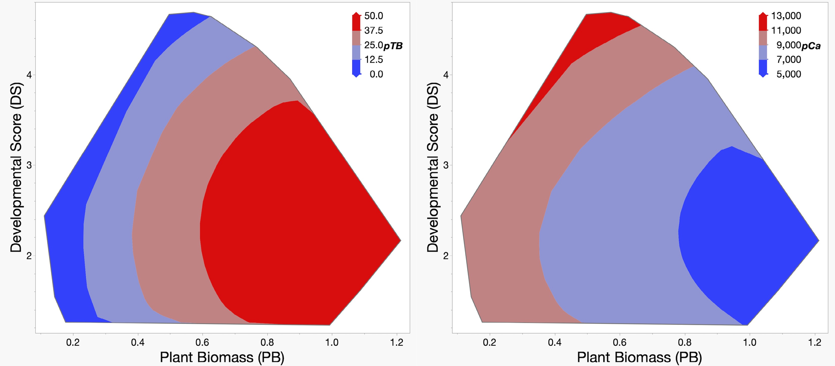 Our findings, supported by structural equation modeling, demonstrated that including Ca as a predictor significantly improves the model fit for TB, yet it does not explain the entirety of the variance. This confirms that TB risk is a product of a supply–demand imbalance where plant biomass (PB) and developmental rate (DS) act as the primary regulatory drivers. Specifically, our response surface modeling visualized a critical threshold: accessions with high biomass and slow developmental progress are at the highest risk. This suggests a demand-side bottleneck; as biomass increases, the plant's ability to partition sufficient Ca to every leaf margin is overwhelmed.