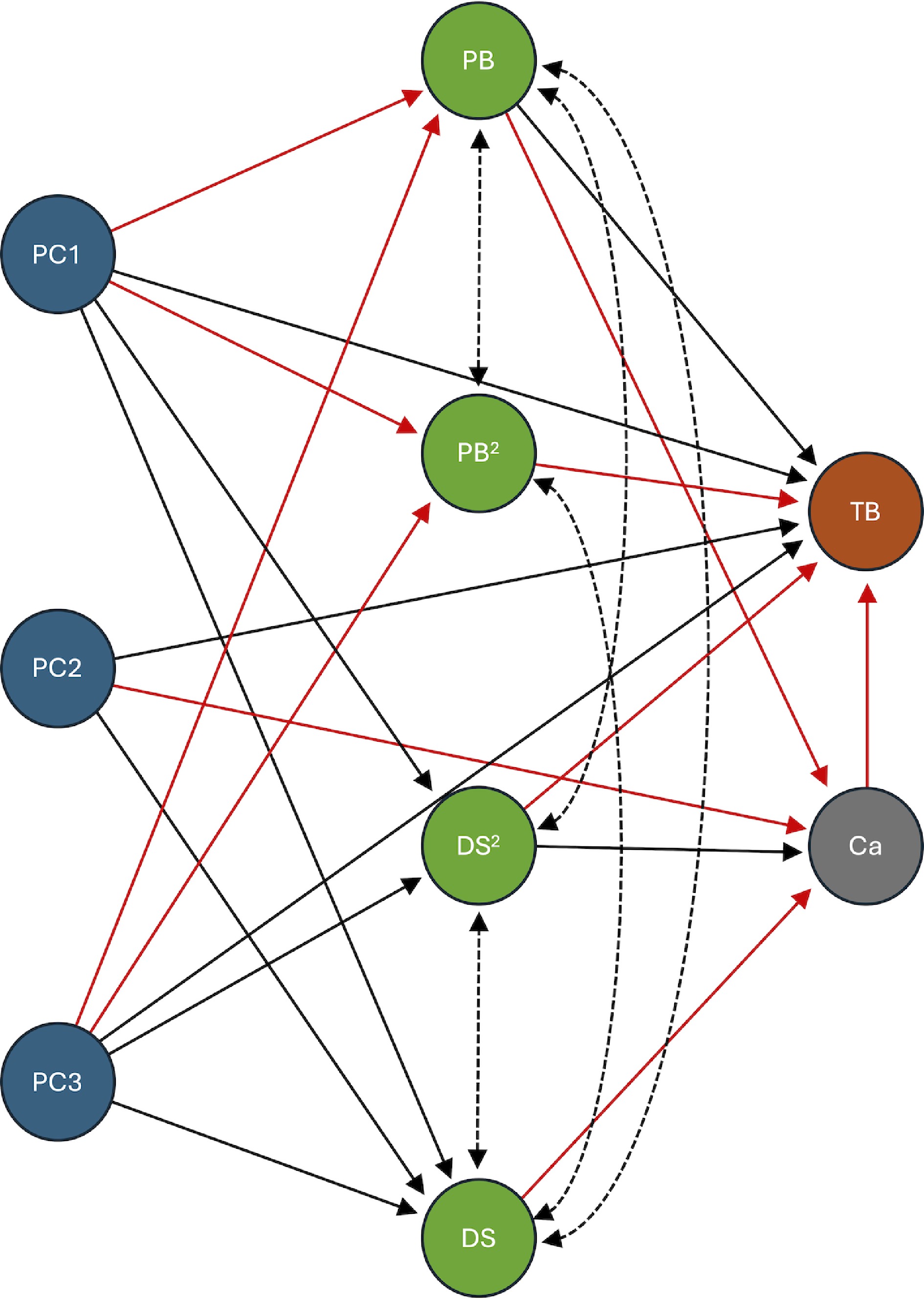 This is consistent with our previous work on tetraploid lettuce, which showed significantly lower TB incidence than their diploid counterparts (1.8% vs 22.2%), despite having lower overall leaf Ca levels[37]. We proposed that the slower developmental cadence in the tetraploids leads to a reduction in the peak Ca demand, which matches the current supply-demand model. By integrating population structure (PCs) into our SEM, we also observed that principal components representing the genetic background had indirect effects on TB via their influence on DS and PB. This implies that certain horticultural types carry correlated physiological traits that inherently influence TB risk. This suggests that some of the resistance observed in specific market types is not due to TB-specific genes alone, but rather a byproduct of their growth architecture and developmental timing.