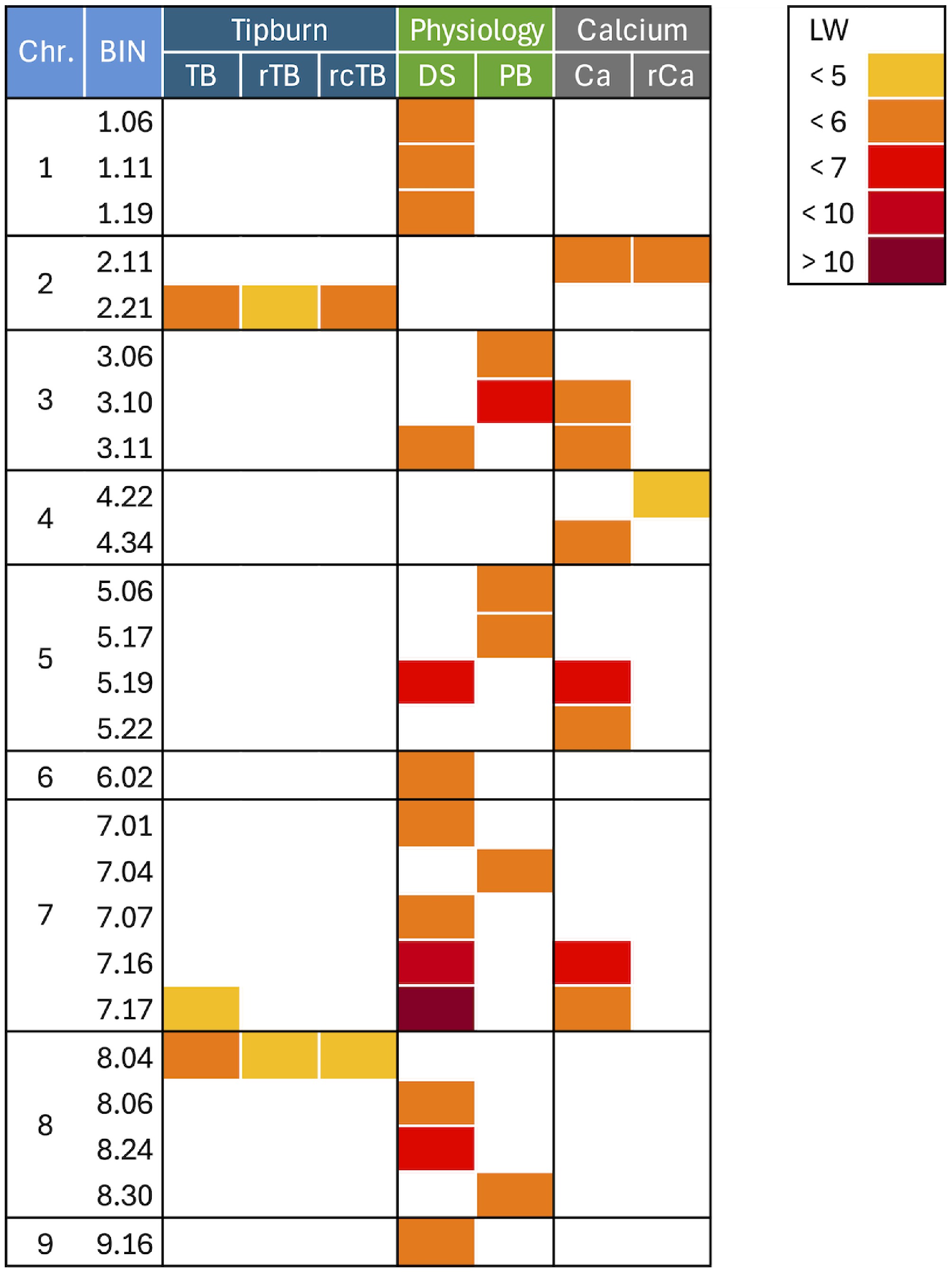Heatmap of quantitative trait loci. Visualized are the positions of significant quantitative trait loci (QTLs) across the lettuce genome. The QTLs are placed into BINs, which are identified by their chromosome number and a unique BIN identification number. The lettuce reference genome was partitioned into 10 Mb BINs, and QTLs detected on adjacent BINs are considered a single associated genomic region. The traits analyzed were: plant biomass (PB), developmental score (DS), calcium content (Ca), residual of calcium content after accounting for genetic background, PB, and DS (rCa), tipburn (TB), residual of tipburn after accounting for genetic background, PB, and DS (rTB), residual of tipburn after accounting for genetic background, PB, DS, and Ca (rcTB). The legend in the upper right corner indicates the significance of the QTLs using LogWorth (LW), a measure of statistical significance defined as −log10 (p-value).