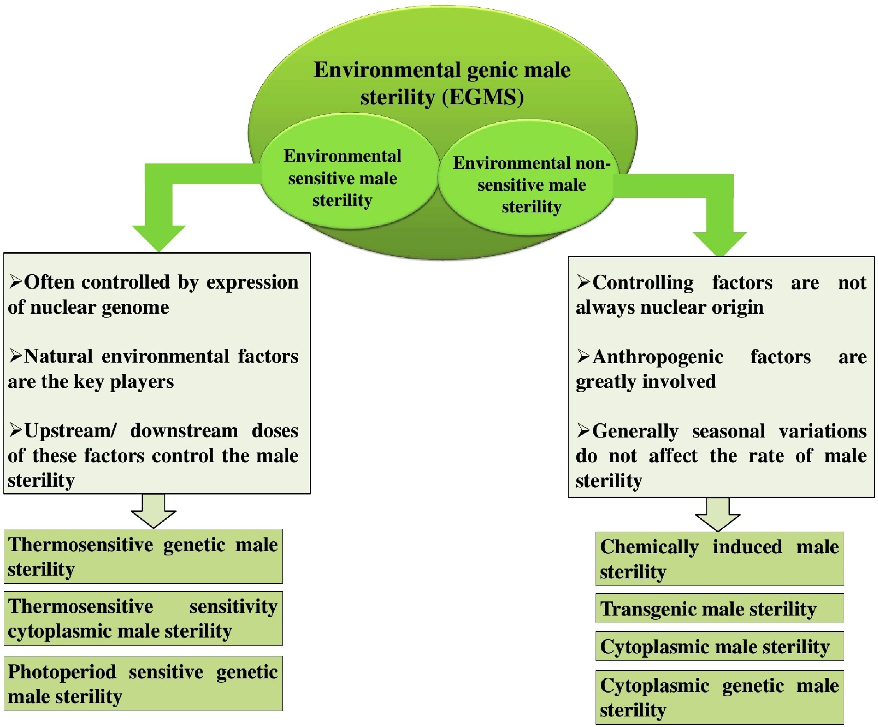 Types of environmental genic male sterility (EGMS). Environmental sensitive male sterility (ESMS): Male sterility triggered by specific environmental conditions. Environmental non-sensitive male sterility (ENSMS): Male sterility that remains unaffected by environmental variations.