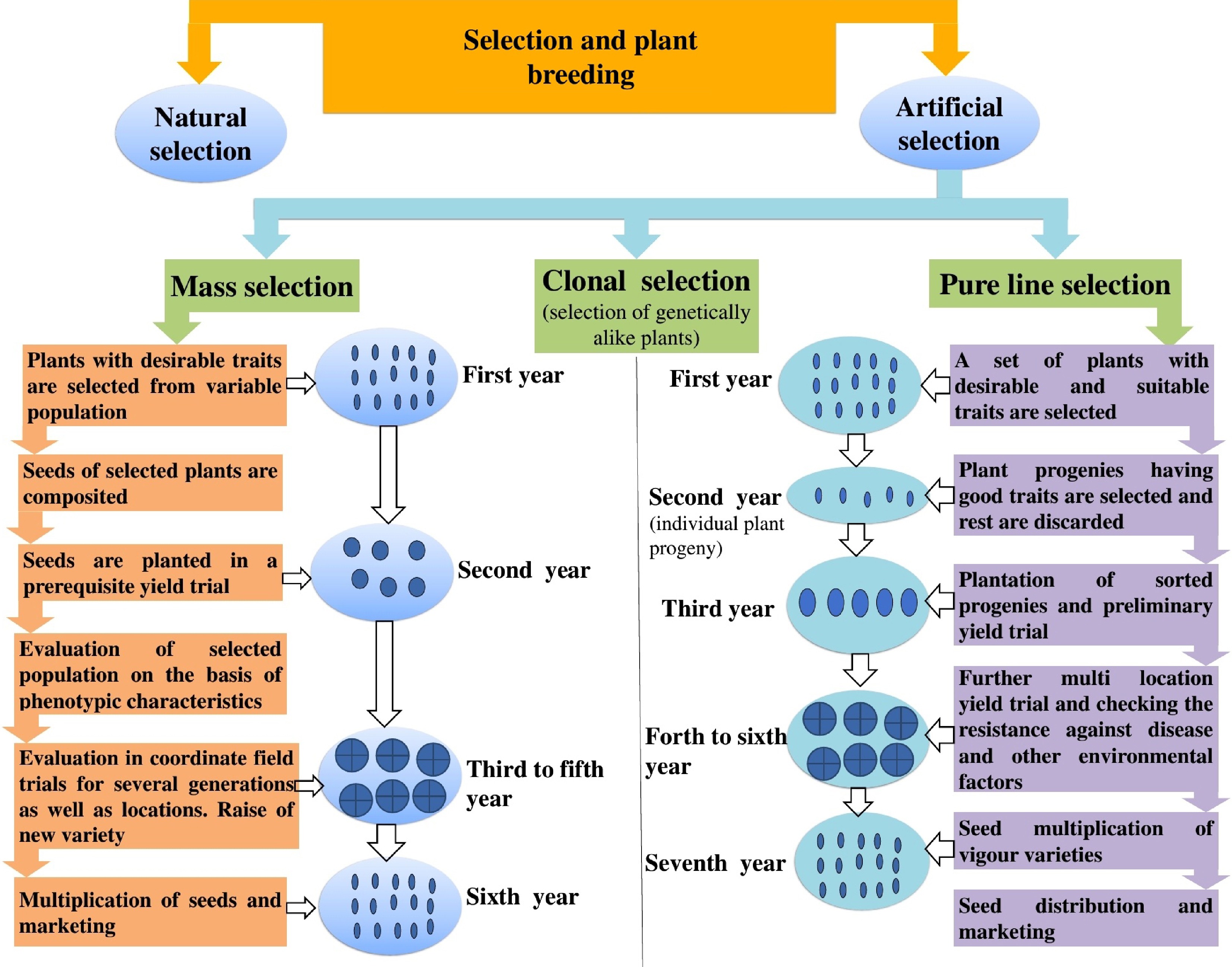 Role of various selection strategies in plant breeding. This figure demonstrates how different selection methods contribute to the improvement of vegetable crop plants.