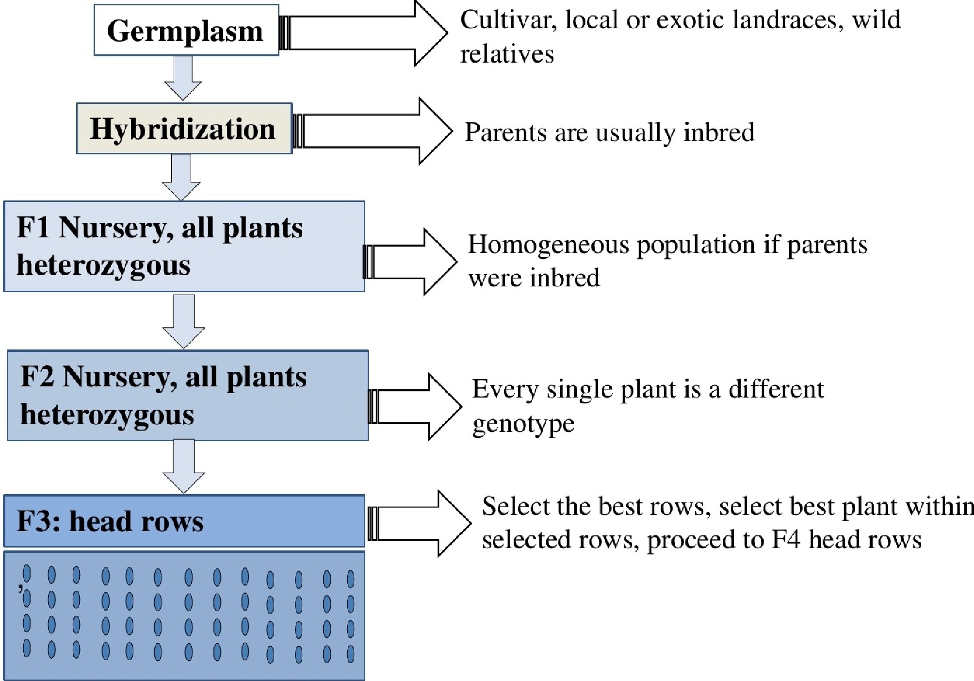 Graphical presentation of cultivar development in self-pollinated species using the pedigree method, illustrating the typical steps involved in developing new cultivars for self-pollinated species.