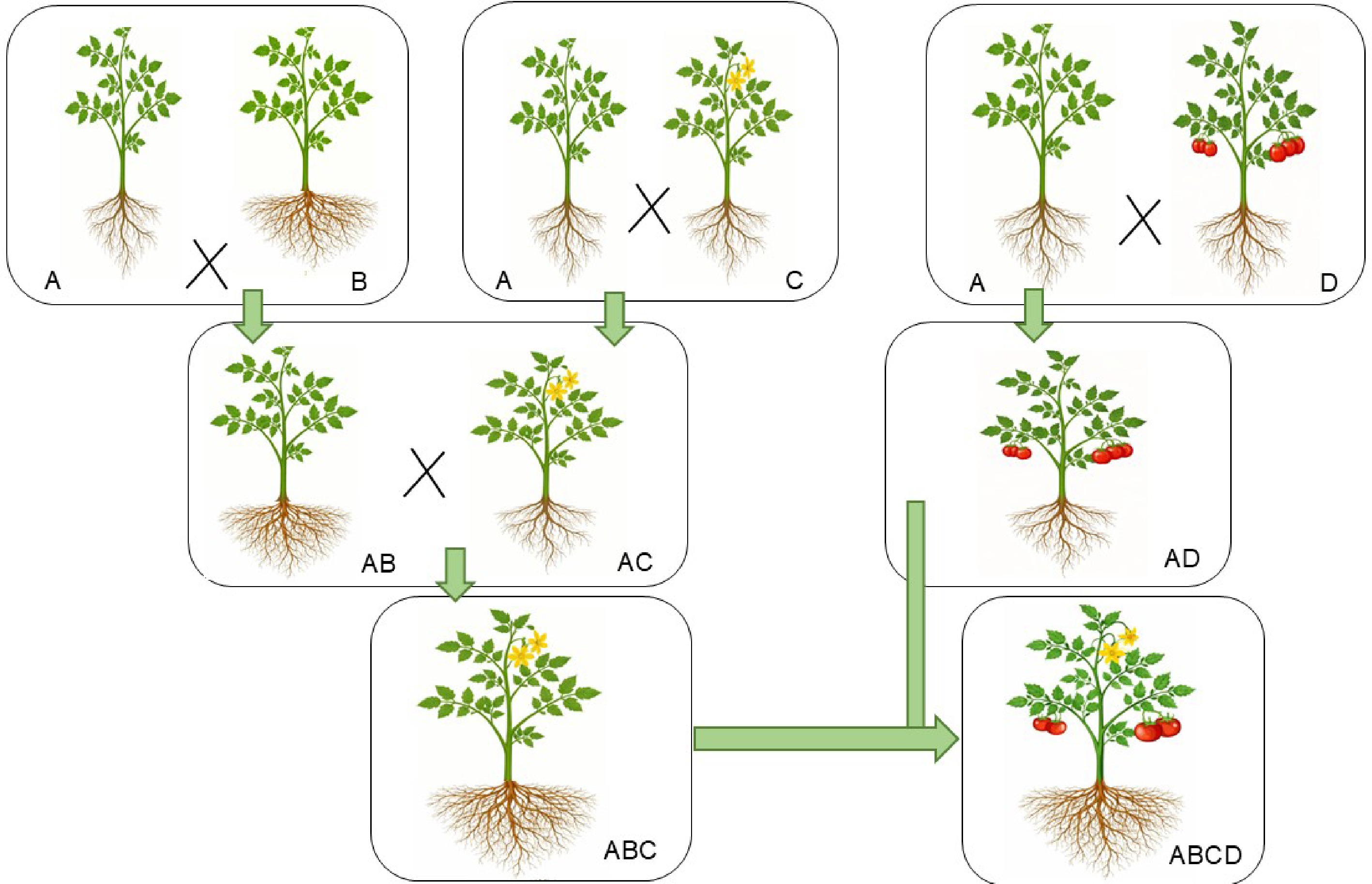 Gene pyramiding for vegetable crop enhancement and high-yield varieties. This figure highlights the role of gene pyramiding in developing vegetable crops with multiple desirable traits. The key traits include: Trait A, plants with simple shoot and root systems; Trait B, plants with high-yielding roots and simple shoots; Trait C, plants with potent flowering alongside simple root and shoot systems; Trait D, plants with a high rate of fruit setting and simple shoot and root systems, respectively.