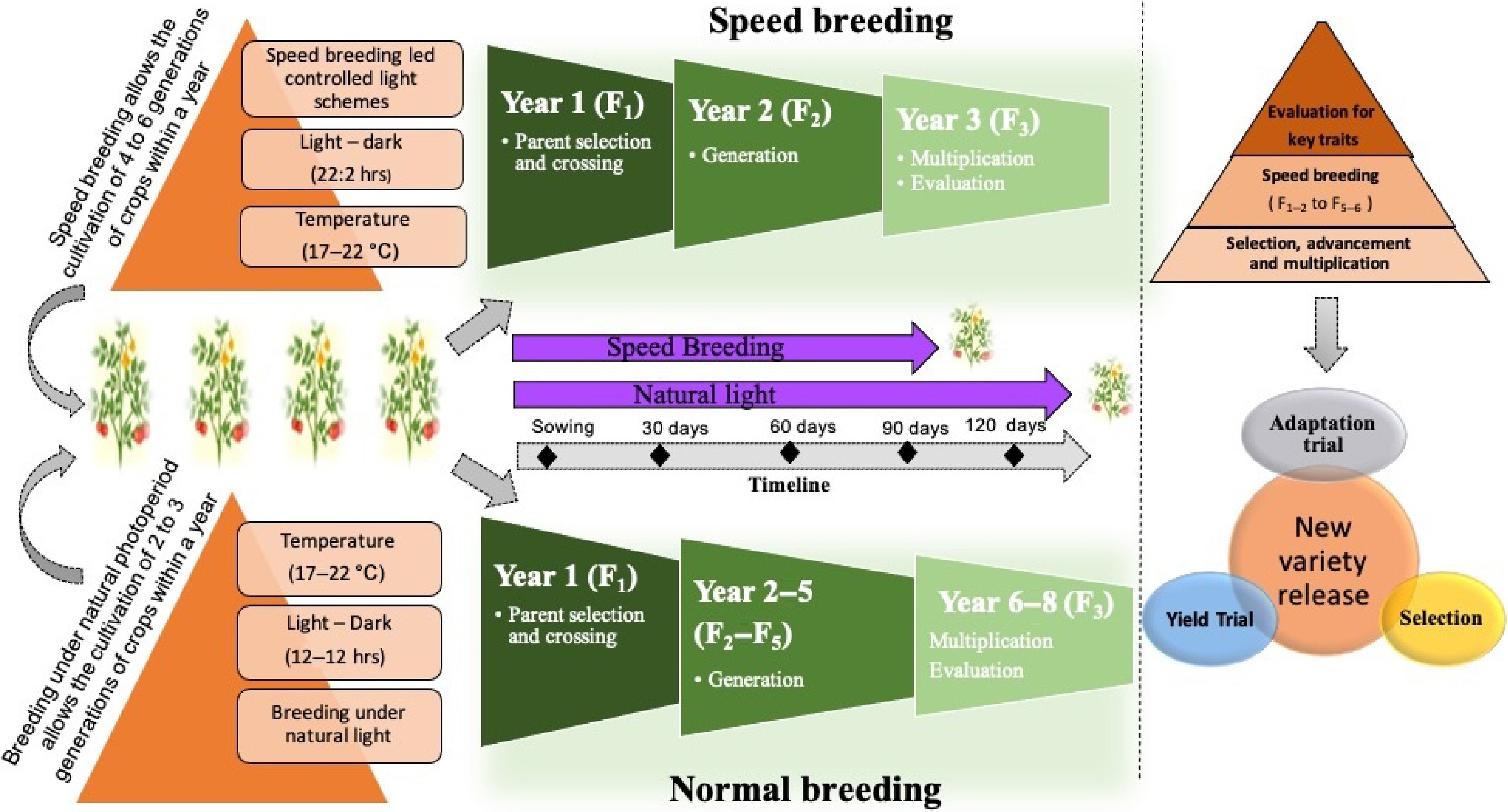 Speed breeding in vegetable crops relies on optimizing light regimes, temperature, and controlled environments to hasten growth and reduce generation time. For example, extended photoperiods and regulated temperatures in growth chambers or greenhouses can enable multiple generations per year in crops such as tomato, lettuce, and pepper, far beyond what is possible under conventional field conditions. Some of the speed breeding strategies are discussed below.