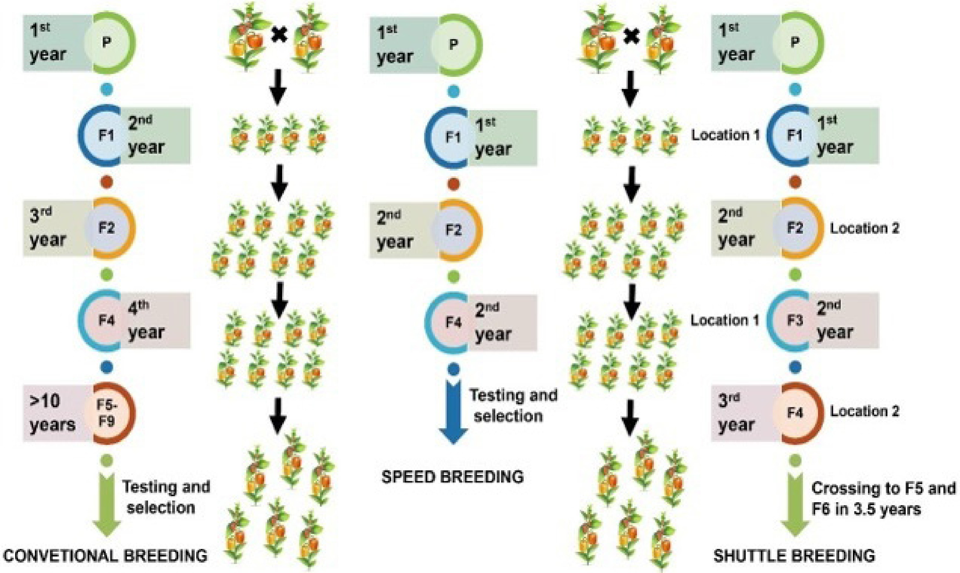 Comparative representation of conventional, speed, and shuttle breeding techniques in vegetable crop improvement, showcasing the efficiency and timeframes.