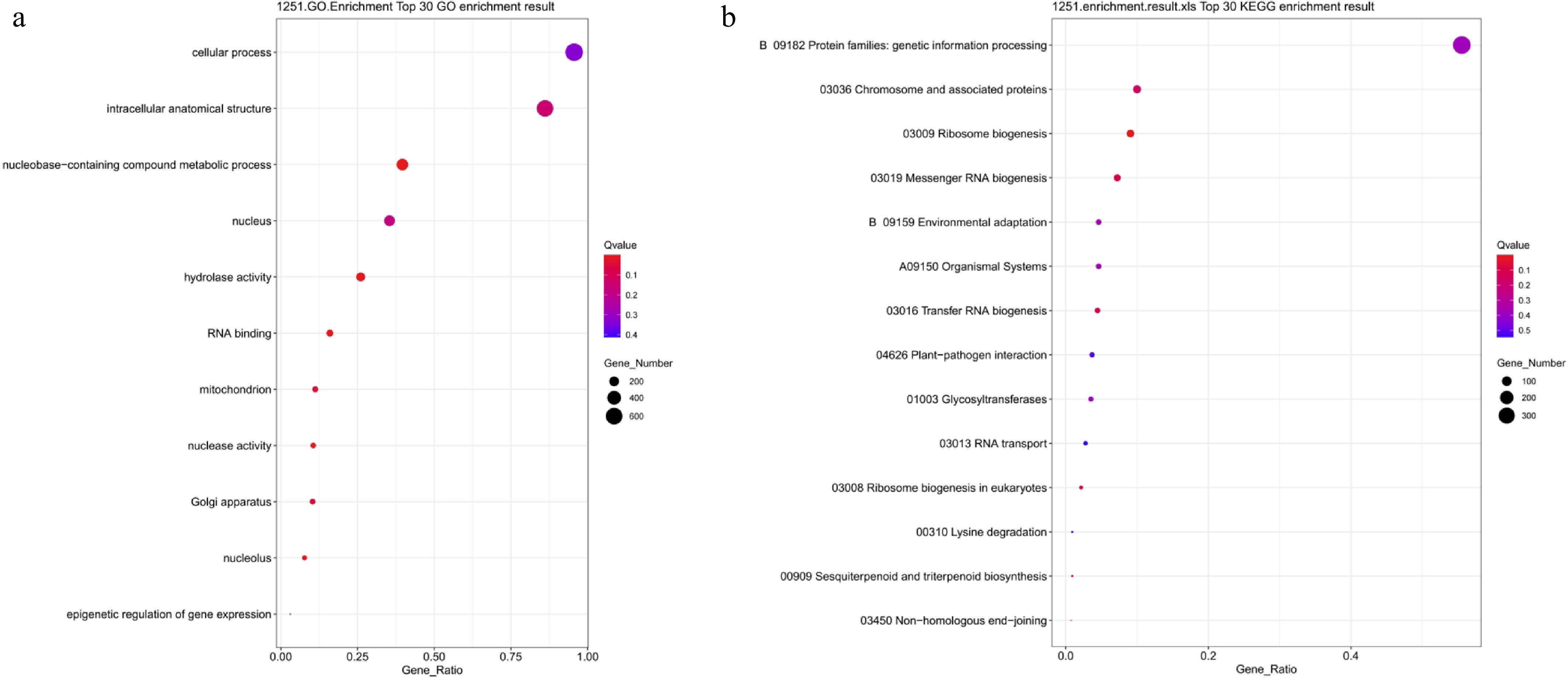 GO and KEGG functional enrichment analysis of NaCl-treated differentially expressed genes. (a) GO enrichment analysis; (b) KEGG enrichment analysis. Bubble size indicates the number of enriched genes, color represents significance (Q-value), and the horizontal axis shows enrichment factor. A smaller Q-value indicates more significant enrichment.