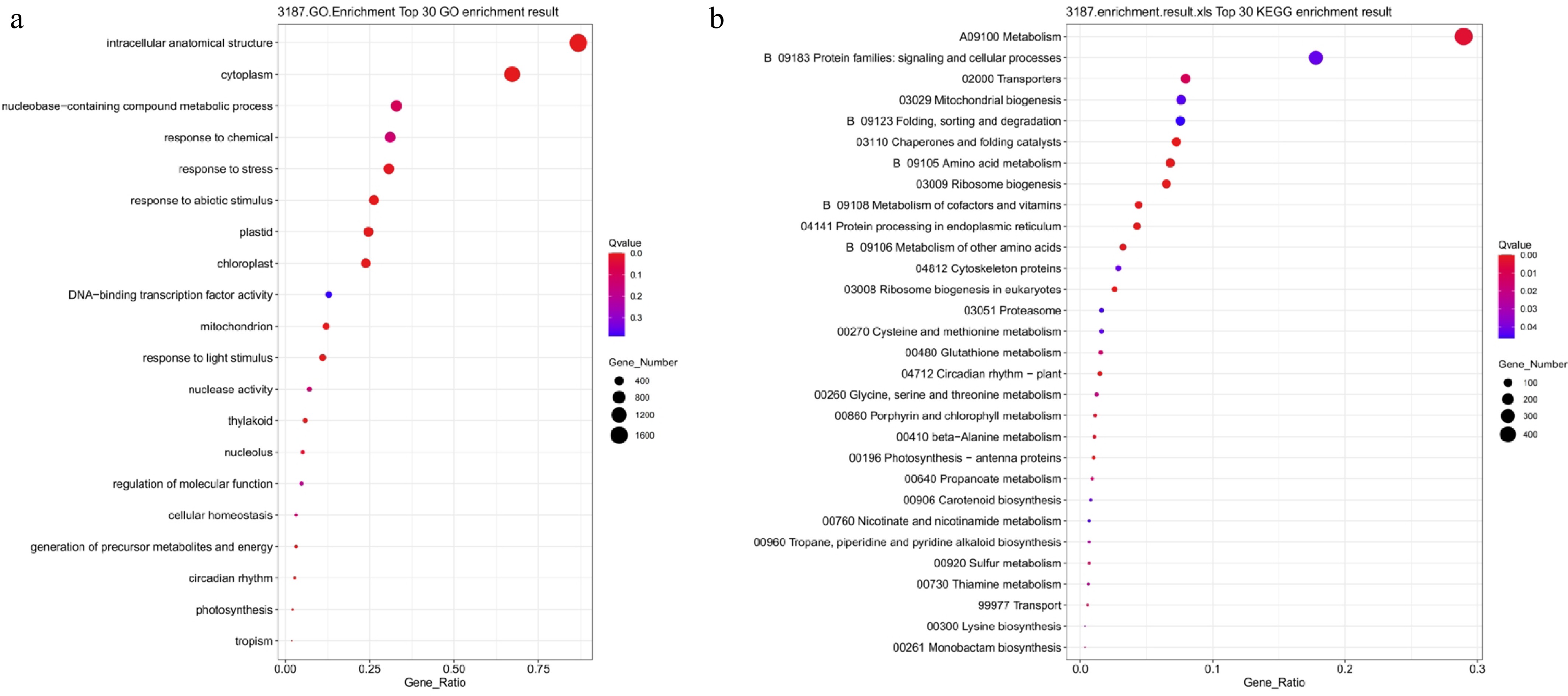 GO and KEGG functional enrichment analysis of PEG-treated differentially expressed genes. (a) GO enrichment analysis; (b) KEGG enrichment analysis. Bubble size indicates the number of enriched genes, color represents significance (Q-value), and the horizontal axis shows enrichment factor. A smaller Q-value indicates more significant enrichment.