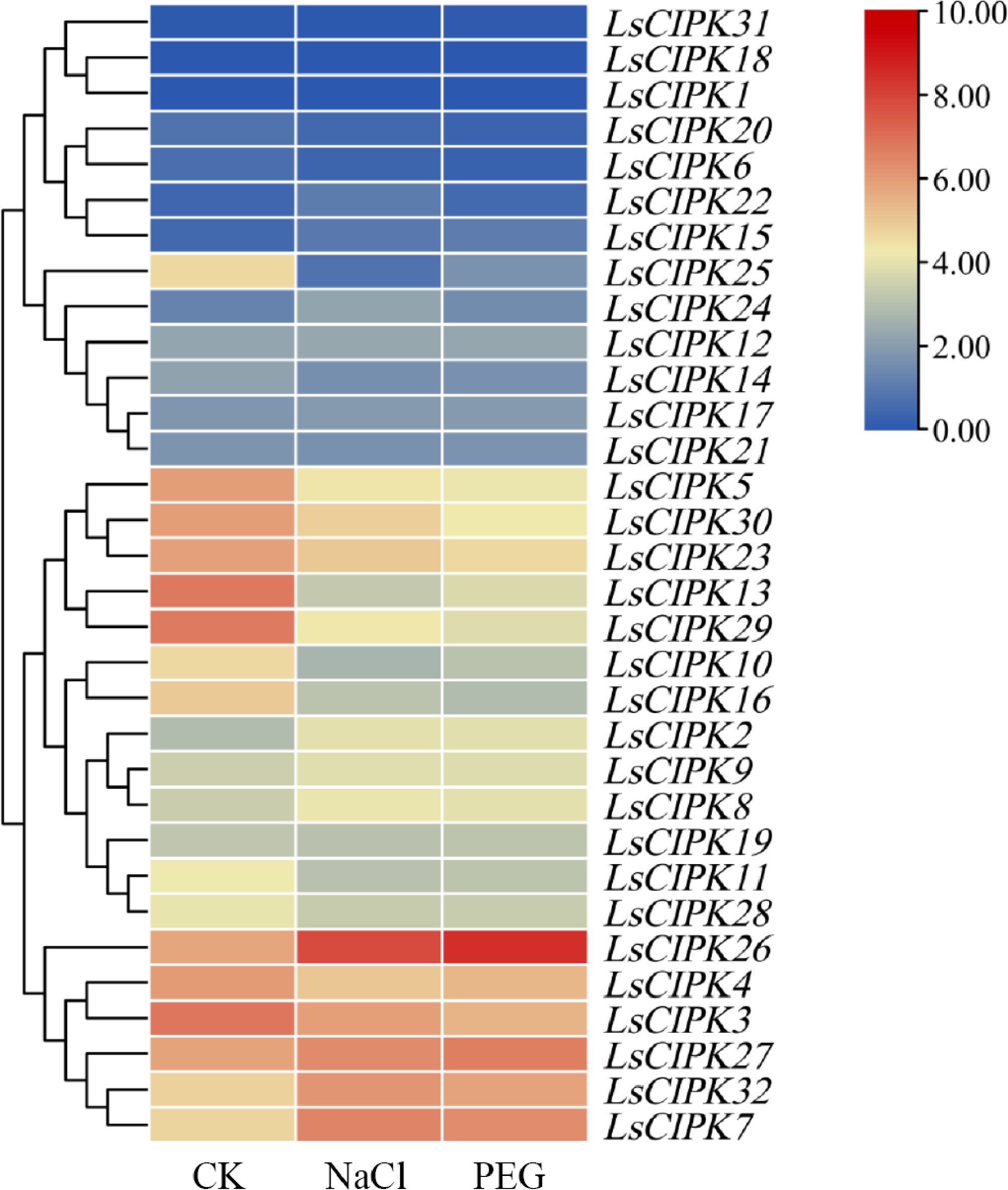 Heatmap of expression patterns of the LsCIPK genes under salt stress (NaCl) and drought stress (PEG) treatments. The color bars in the heatmap represent expression levels converted to log2 (log2[TPM + 1]), with values ranging from 0 to 10: dark blue indicates lower expression, while dark red indicates higher expression. CK denotes the control group, NaCl represents the salt stress treatment group, and PEG indicates the drought stress treatment group.