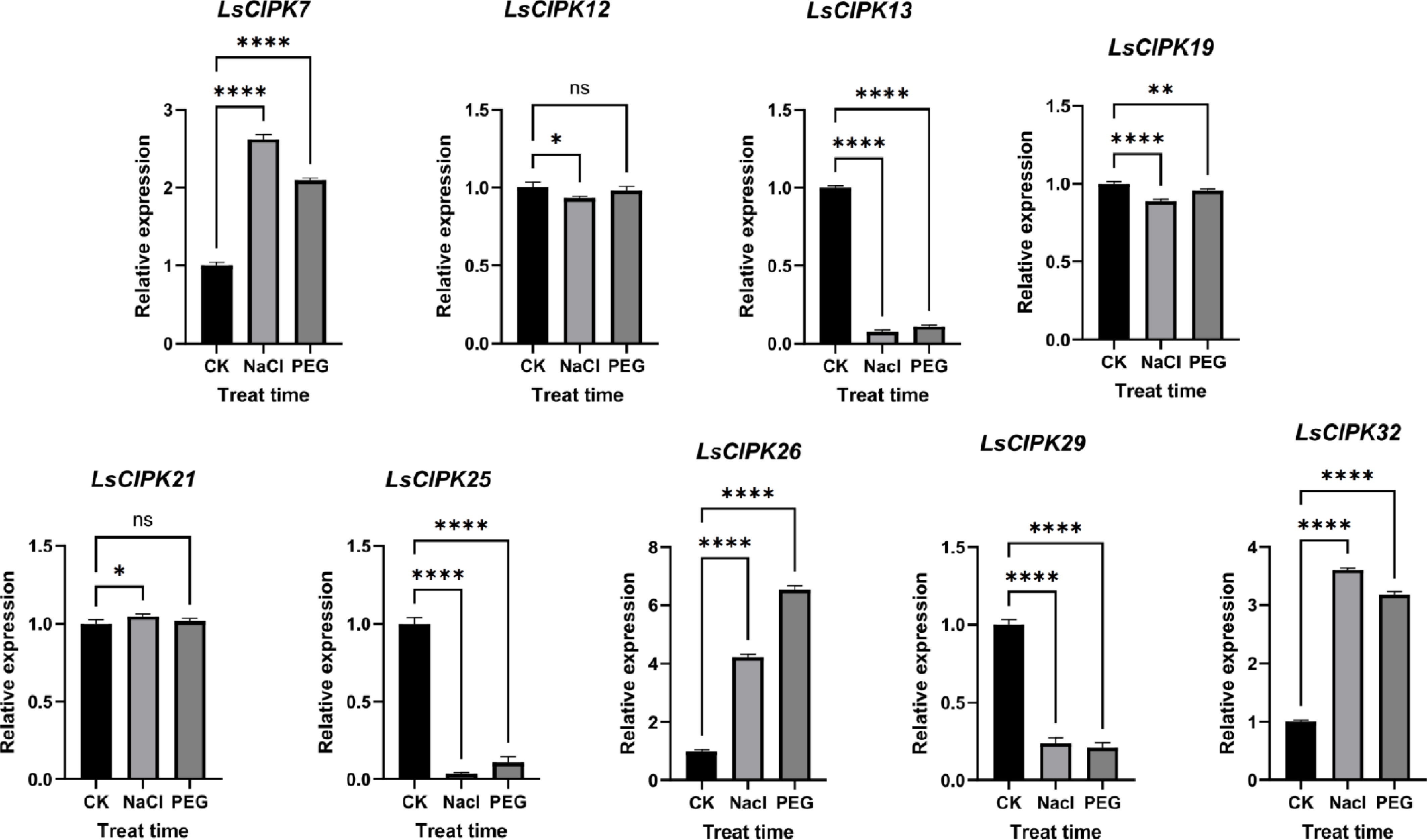 qRT-PCR expression analysis of the lettuce CIPK genes under salt (NaCl), and drought (PEG) stress. CK represents the control group, NaCl denotes the salt stress treatment group, and PEG indicates the drought stress treatment group; error bars represent standard errors (n = 5); ns indicates p > 0.05, * p < 0.05, ** p < 0.01, *** p < 0.001, **** p < 0.0001.