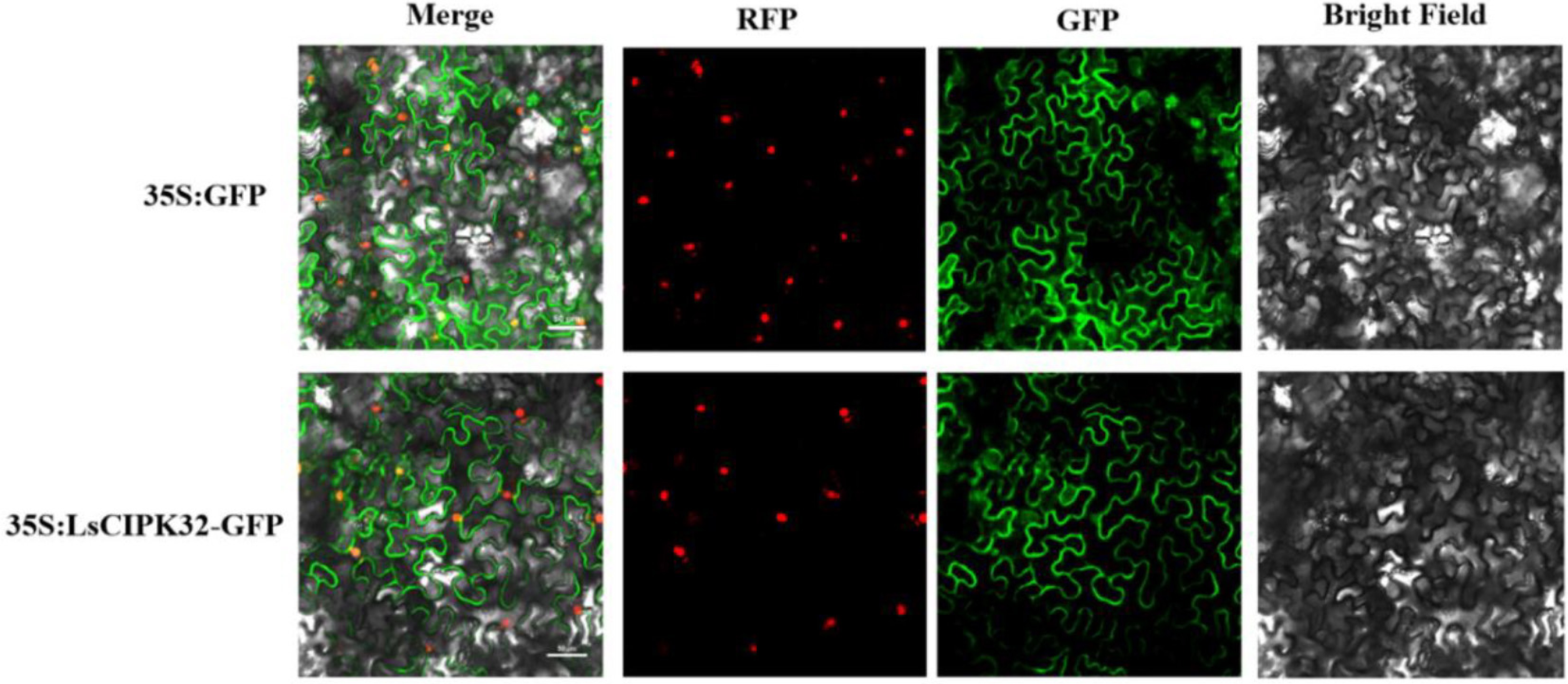 Subcellular localization analysis of the LsCIPK32 protein. Merge, RFP, GFP, and Bright Field represent signal merging, red fluorescence channel, green fluorescence channel, and bright field image, respectively. Scale bar = 50 μm.