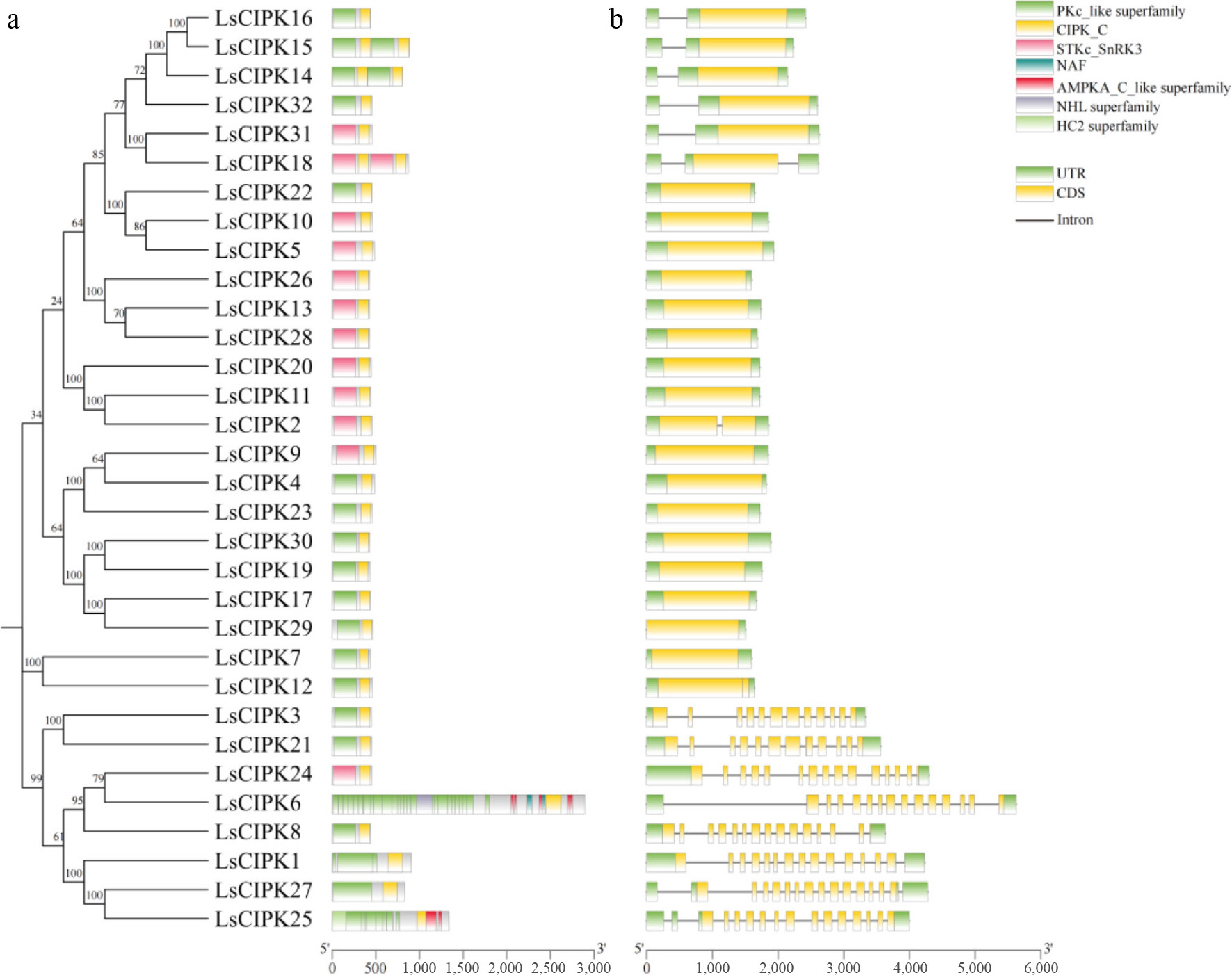 Conserved domains and gene structure analysis of the CIPK gene family in lettuce. (a) Conserved domain distribution of the LsCIPK protein. Different colors represent different domain types; the corresponding domain names are labeled on the right. (b) Exon-intron structure of the LsCIPK gene. Yellow boxes represent coding regions (CDS), green boxes represent untranslated regions (UTR), and black lines represent introns.