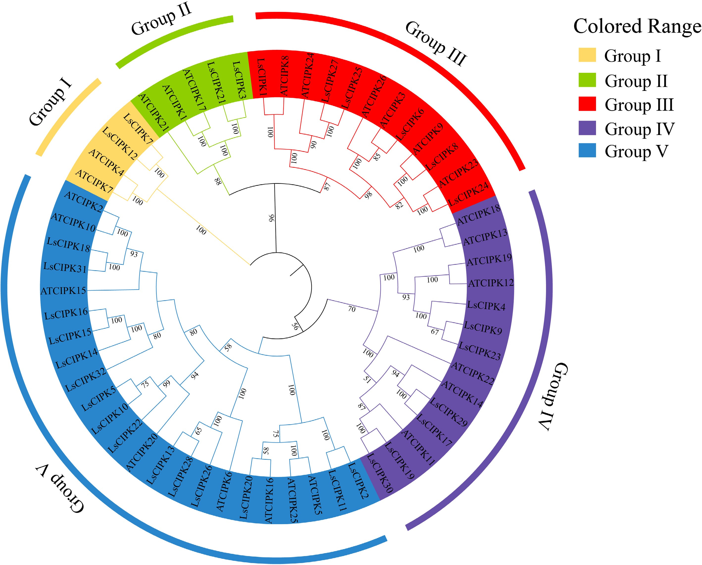 Phylogenetic tree of the CIPK gene family in lettuce and Arabidopsis. Different colors represent five evolutionary branches (Group I–V). CIPK proteins in lettuce and Arabidopsis are distinguished as 'LsCIPK' and 'AtCIPK'.